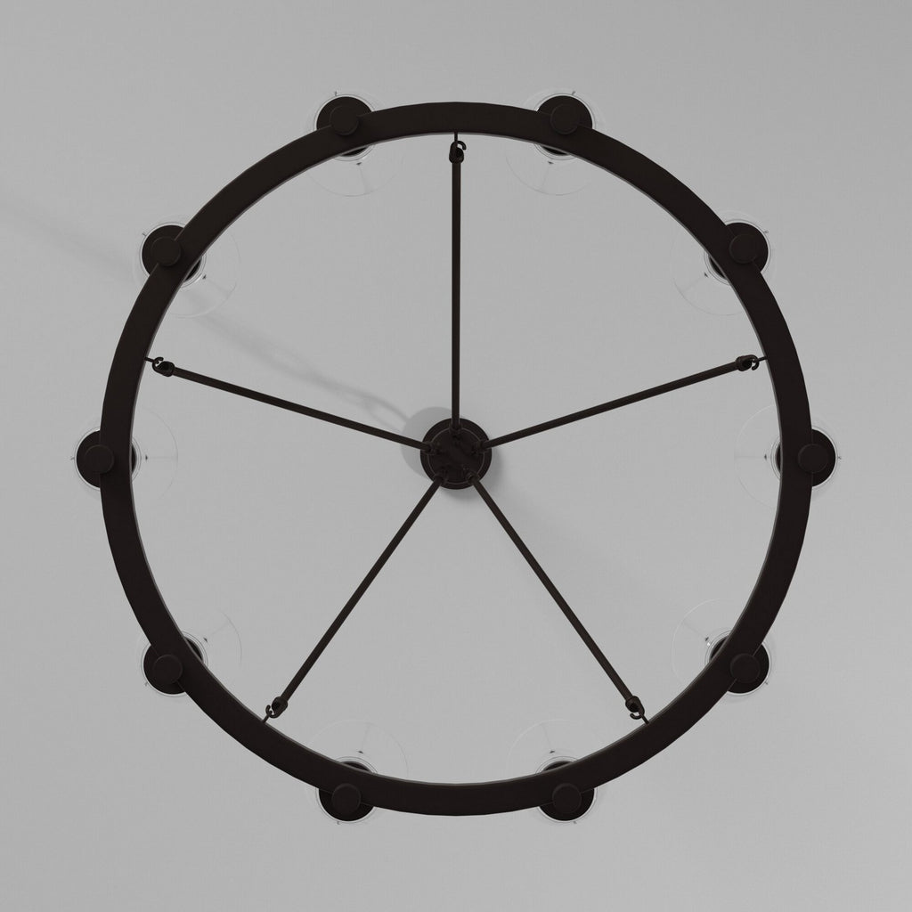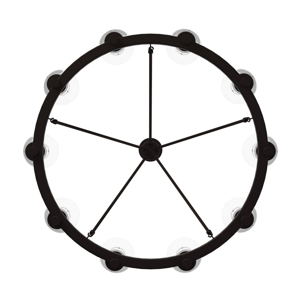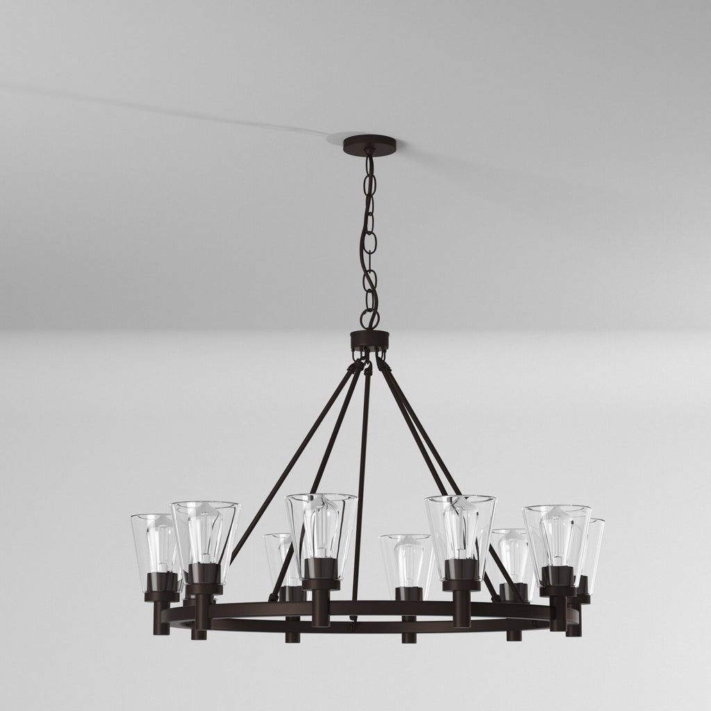 The "Clarence" collection is comprised of a rich oil rubbed bronze finish that ties up with clear cone shaped glassware. Shown with retro type Edison bulbs for maximum aesthetic beauty. Also available in a plated brushed nickel version. Single tier ten light model shown.