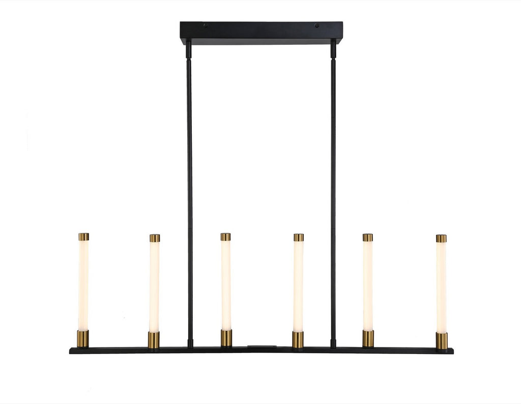 The Infiniti Collection by Steven Sabados of the S&C design firm, is stunning and quite unique. The frame is a matte black and the candle sticks are illuminated by bright energy efficient LED which have brass accents on both ends. Linear island model shown.