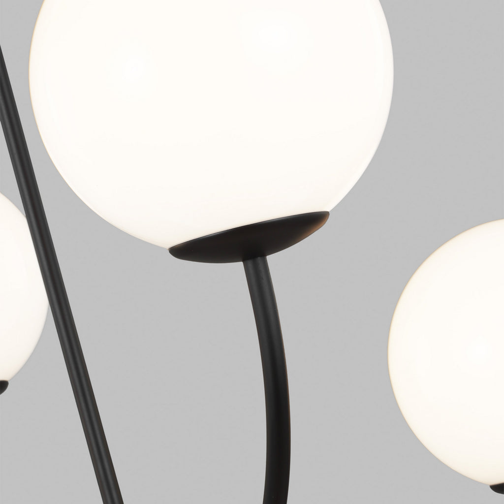 The Galassia four light single tier chandelier by AERIN in midnight black balances glass globes on an elongated frame, which gives it a contemporary look. The white glass casts a soft, welcoming glow, while the elongated frame works particularly well in large, high-ceiling rooms.