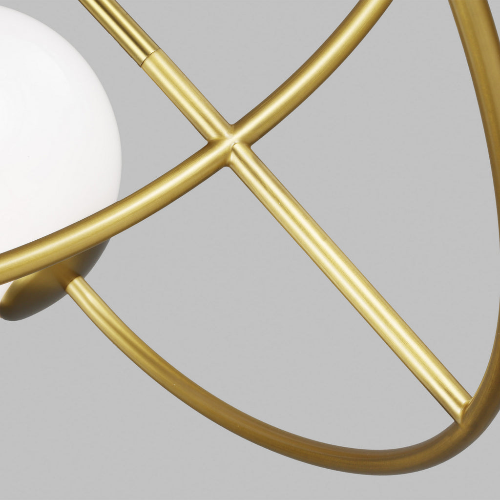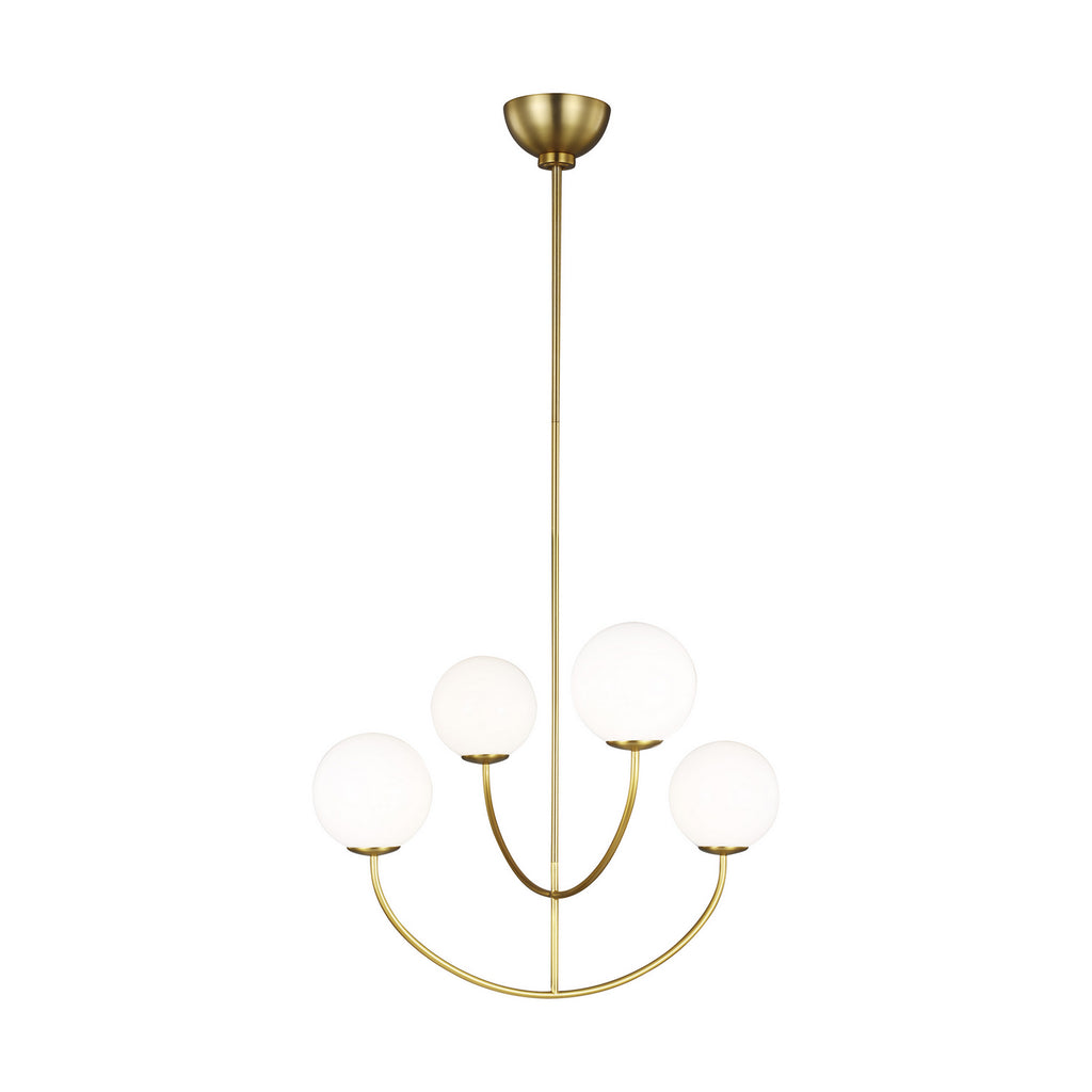 The Galassia four light single tier chandelier by AERIN in burnished brass balances glass globes on an elongated frame, which gives it a contemporary look. The white glass casts a soft, welcoming glow, while the elongated frame works particularly well in large, high-ceiling rooms.