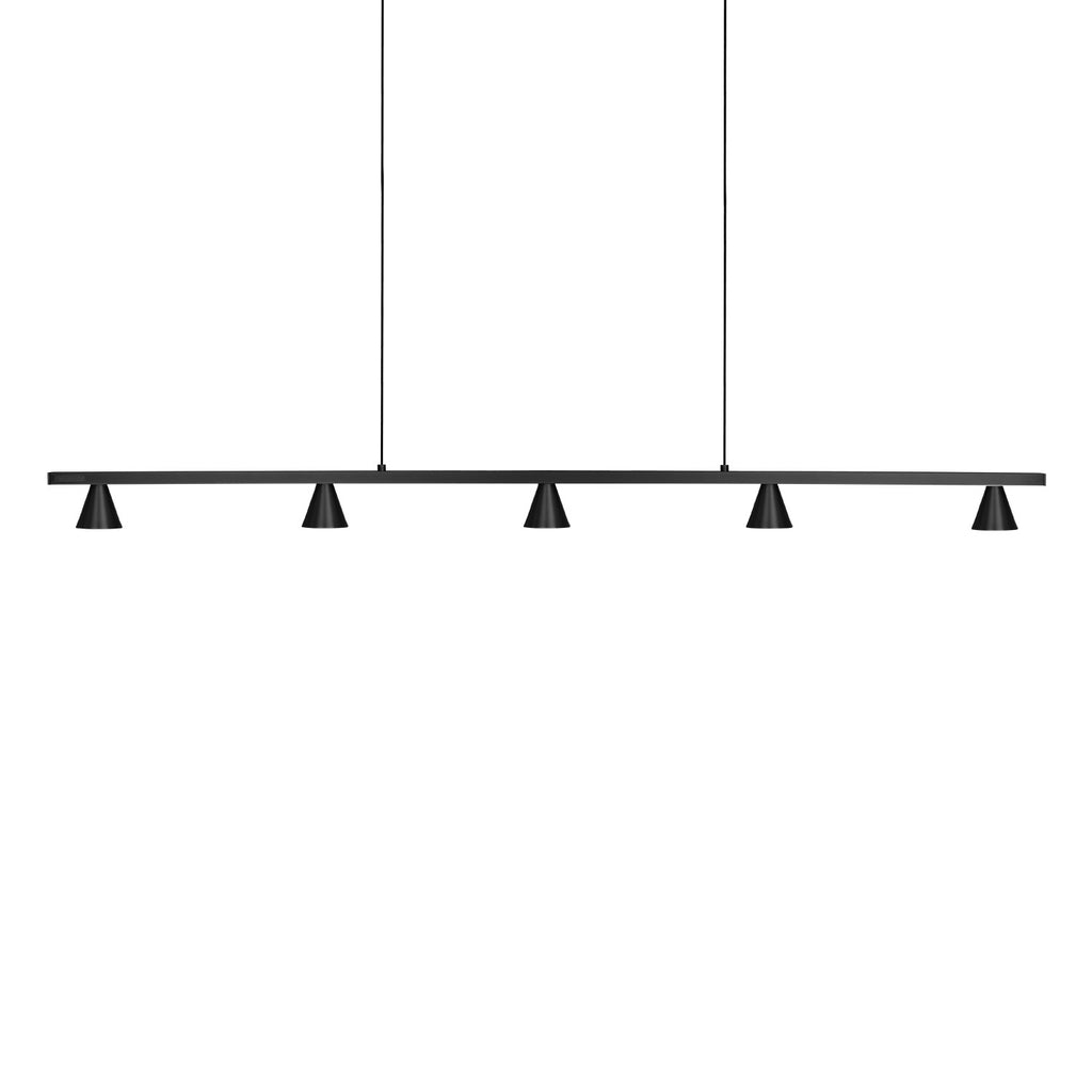 Multiple aluminum cones are connected inline and direct light downwards from the geometric linear pendant. The Dune series utilizes classic minimalist lamp shapes yet in reduced scale to elegant effect. The LED spot sources are focused by diminutive reflectors housed within the exquisitely turned shades. Available in multiple configurations and finishes.