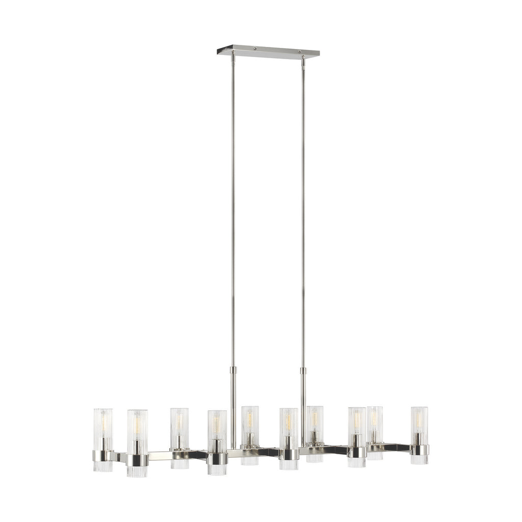 In the Geneva ten light billiard island chandelier, slender fluted shades form an elegant, dynamic silhouette that's balanced by a strong frame of Burnished Brass or Polished Nickel.