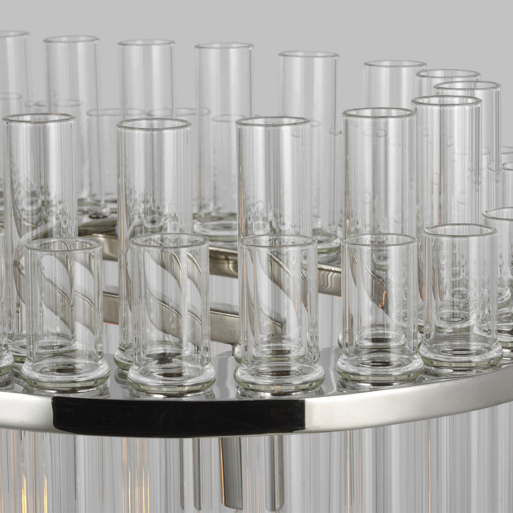 The Beckett family from Chapman & Myers presents Art Deco forms with a modern minimalist sensibility. Crafted of steel, a round metal band holds the clear extruded glass cylinders in place. The Beckett twelve light single-tier chandelier in burnished brass is the perfect way to achieve your home's desired fashion or functional needs.