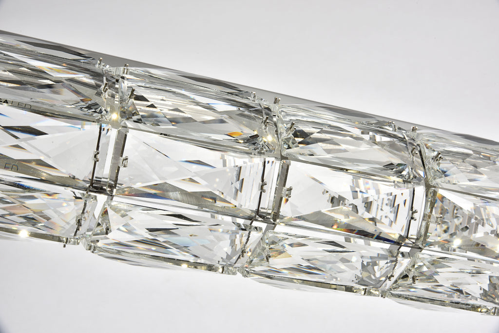 Valetta hanging fixtures dress up a living room, dining room, or bedroom without overwhelming the surrounding décor. This collection features an octagonal tube-shaped stainless-steel frame that's covered almost entirely with shining rectangular royal-cut clear crystals. Faceted crystal octagonal crystals cover both ends as a charming finishing touch. A rectangular mounting plate is connected to the frame by slender cables that keep everything secure. A sleek chrome finish completes this modern look. Available in three different lengths.