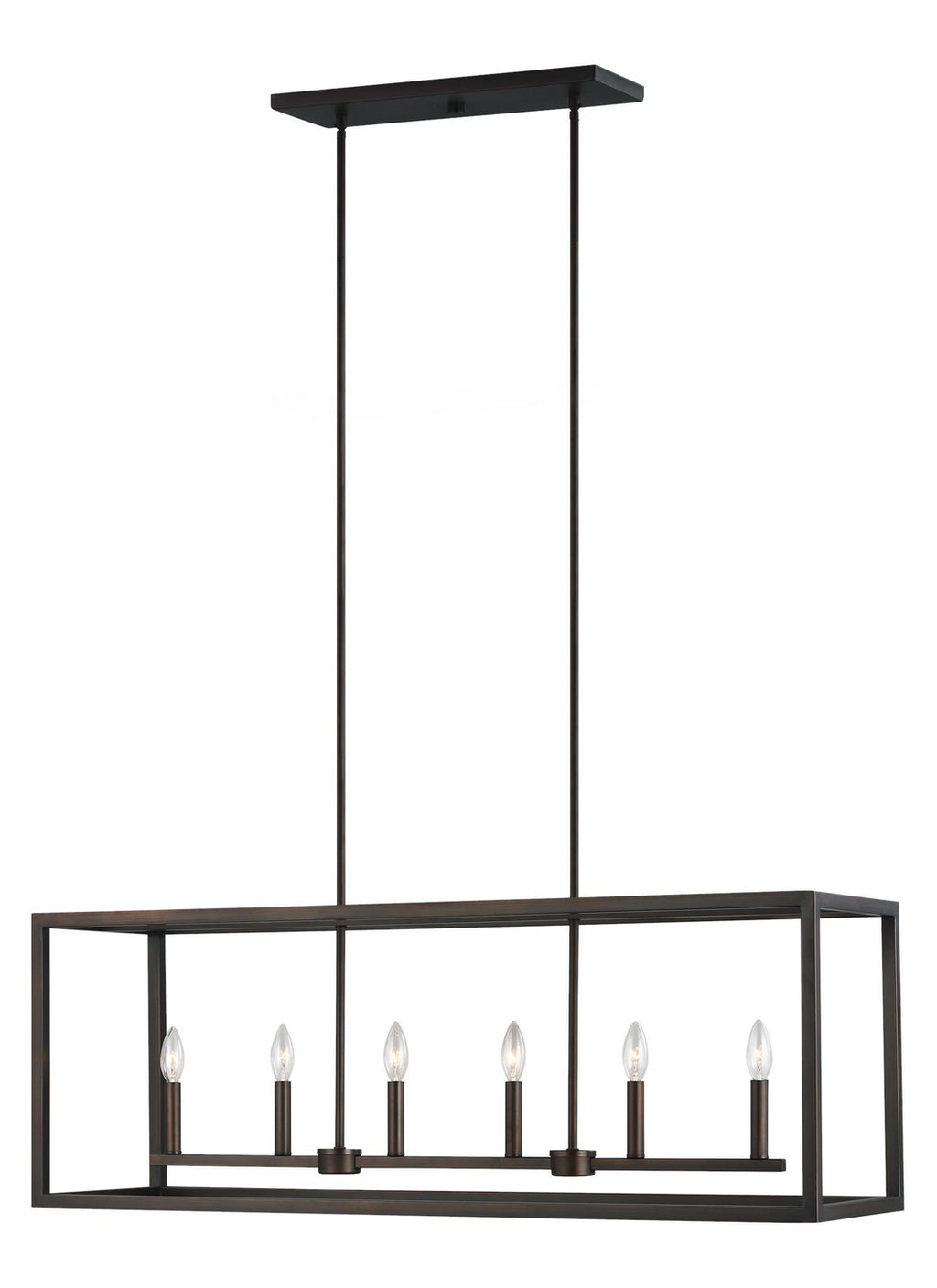 The Moffet Street six light kitchen island light in Bronze offers a distinctive take on a rustic theme. Built in broad steel frames with hand-applied finish that mimics natural wood. This combination of rustic and urban fits comfortably in a wide variety of environments. The sharp, squared lines of the frame complement a wide variety of settings. The collection includes eight-light foyer, four-light foyer, one- light wall sconce, and a six-light island fixture. The Moffet Street Collection is available in three beautiful finishes Washed Pine, Brushed Nickel and Satin Brass All fixtures are California Title 24 compliant and damp rated for use in sheltered, damp environments.