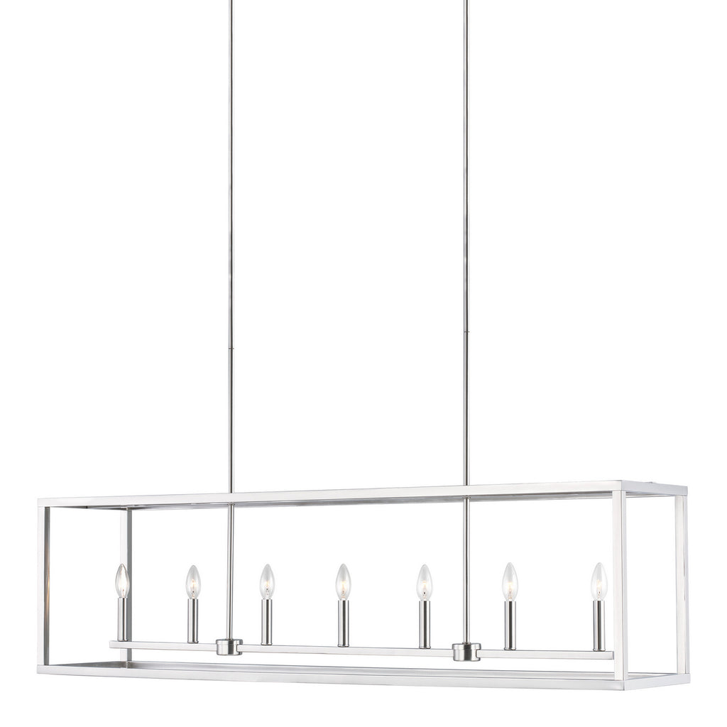 The Moffet Street seven light linear chandelier in brushed nickel supplies ample lighting for your daily needs, while adding a layer of today's style to your home's décor. The Moffet Street series offers a distinctive take on a rustic theme. Built in broad steel frames with hand-applied finish that mimics natural wood. This combination of rustic and urban fits comfortably in a wide variety of environments. The sharp, squared lines of the frame complement a wide variety of settings. The collection includes eight-light foyer, four-light foyer, one- light wall sconce, and a six-light island fixture. The Moffet Street series is available in three beautiful finishes Washed Pine, Brushed Nickel and Satin Bronze All fixtures are California Title 24 compliant and damp rated for use in sheltered, damp environments.