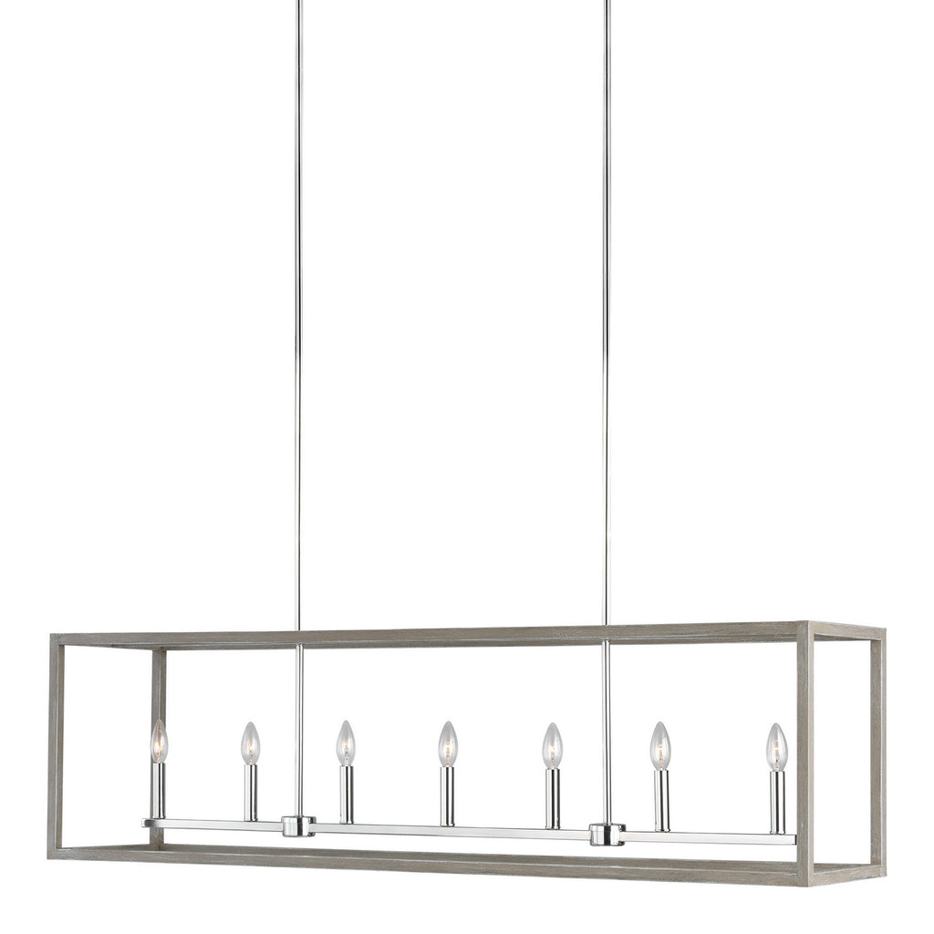 The Moffet Street seven light linear chandelier in washed pine provides abundant light to your home, while adding style and interest. The Moffet Street series offers a distinctive take on a rustic theme. Built in broad steel frames with hand-applied finish that mimics natural wood. This combination of rustic and urban fits comfortably in a wide variety of environments. The sharp, squared lines of the frame complement a wide variety of settings. The collection includes eight-light foyer, four-light foyer, one- light wall sconce, and a six-light island fixture. The Moffet Street series is available in three beautiful finishes Washed Pine, Brushed Nickel and Satin Bronze All fixtures are California Title 24 compliant and damp rated for use in sheltered, damp environments.