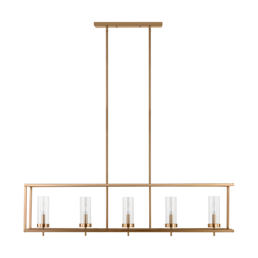 The Zire five light single tier chandelier in Satin Brass uses LED bulbs to save you both time and money. Zire embodies simple clean lines in three finishes that strike a perfect balance of elegant yet minimalist design. Each of the lights sits on the round bottom rim, featuring an Edison-inspired design highlighted by a cylindrical glass shade. The assortment includes nine-light, five-light, and three-light chandeliers, a five light linear, one-light mini-pendant and one-light, two-light, three-light and four-light wall/bath fixtures. A stylish and elegant addition to any room in the house. Zire is offered in a Brushed Oil Rubbed Bronze, Brushed Nickel, Chrome, Satin Brass or Midnight Black finish.
