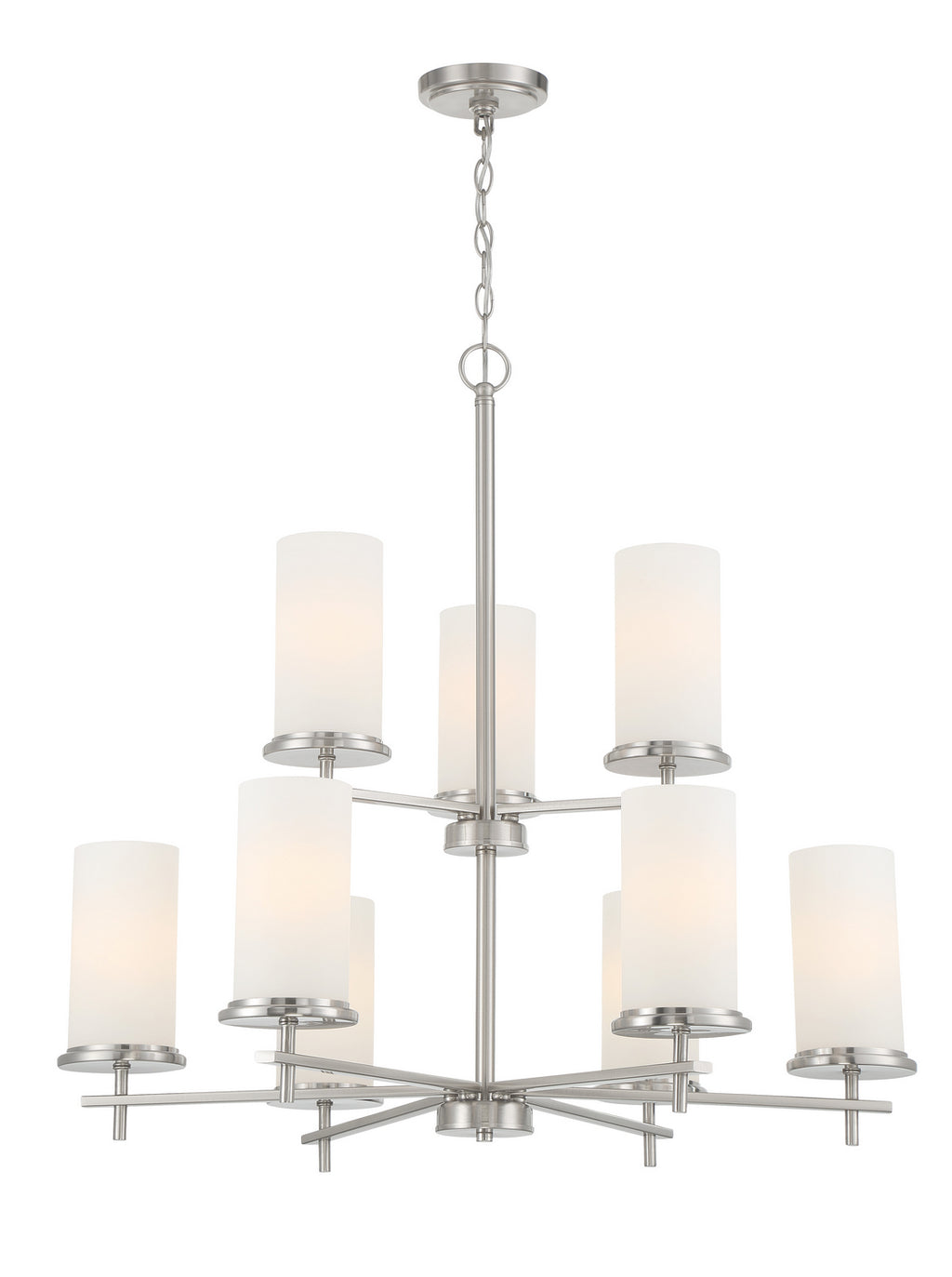 9 Light Chandelier in Brushed Nickel Finish with Etched White Glass