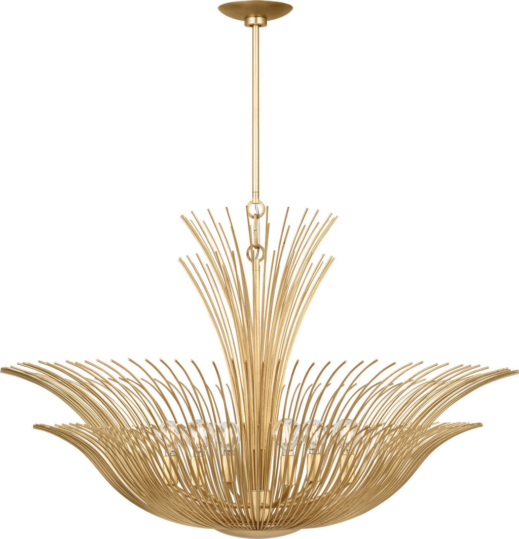The Dorelle 36 Chandelier by Christiane Lemieux expands the collection's architectural glamour into a commanding scale. Its palm-like arms and fluted brass detailing evoke the elegance of French 1930s ateliers, while the layered, hand-gilded finish glows like antique jewelry under candlelight. At 36 inches, this chandelier is ideal for grand dining rooms or living spaces, where its sculptural presence introduces warmth and quiet drama without ostentation. Rooted in history yet crafted for modern interiors, Dorelle is an heirloom design that merges nature, fashion, and architecture in a single, golden bloom.