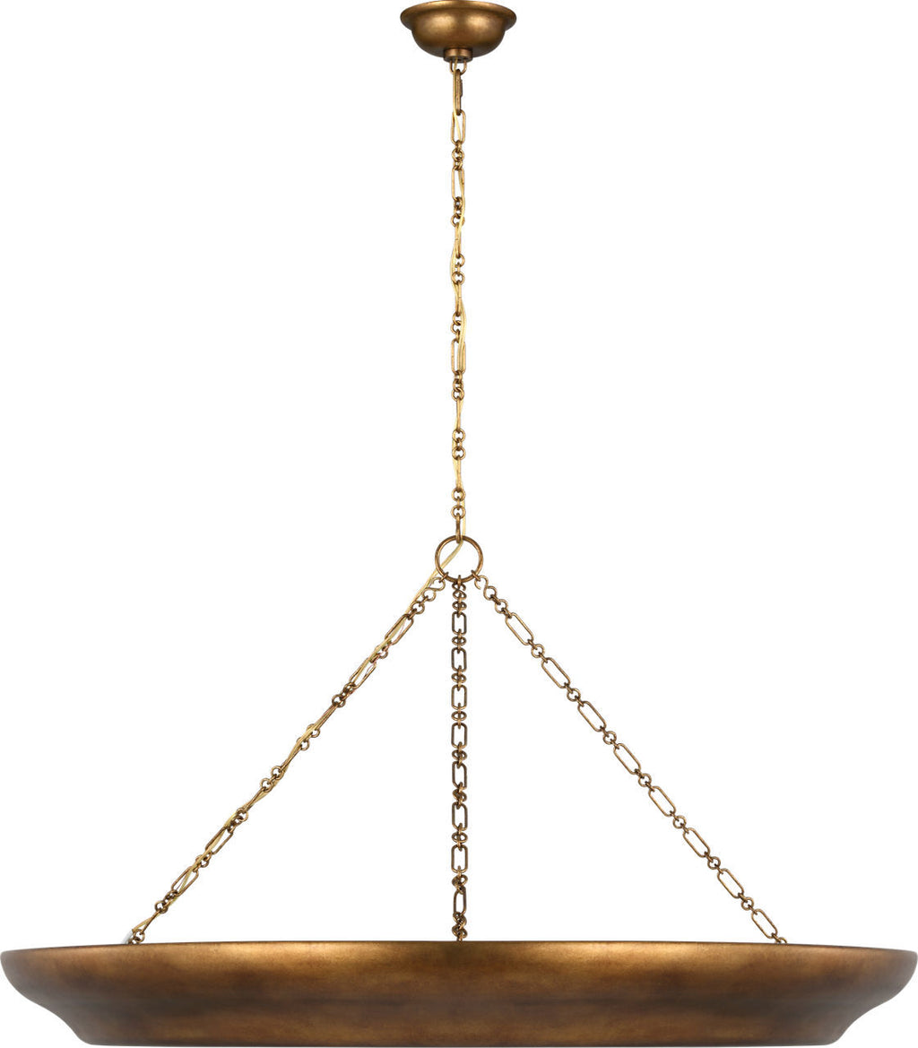 The Lenoir 36 Chandelier by Christiane Lemieux expands the collection's sculptural presence into a commanding scale. Its inverted bowl form, suspended from linked chains, becomes a floating basin of light—a masterclass in contrast with its matte aged iron exterior and luminous gilded core. Inspired by the French 1930s pursuit of purity and proportion, this 36-inch chandelier is ideal for grand dining rooms or open living spaces, where its architectural clarity and artisanal finish create a focal point of quiet sophistication.