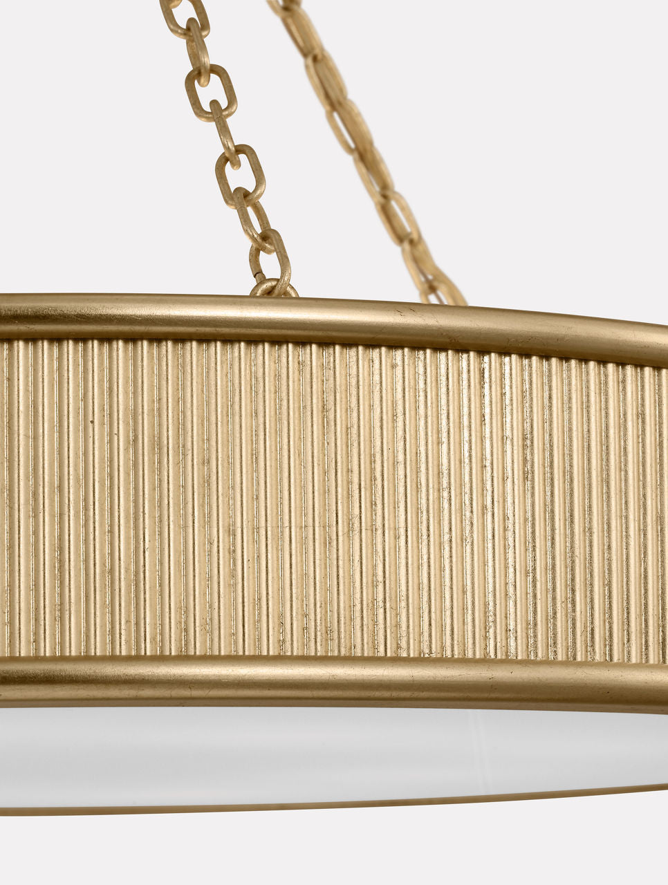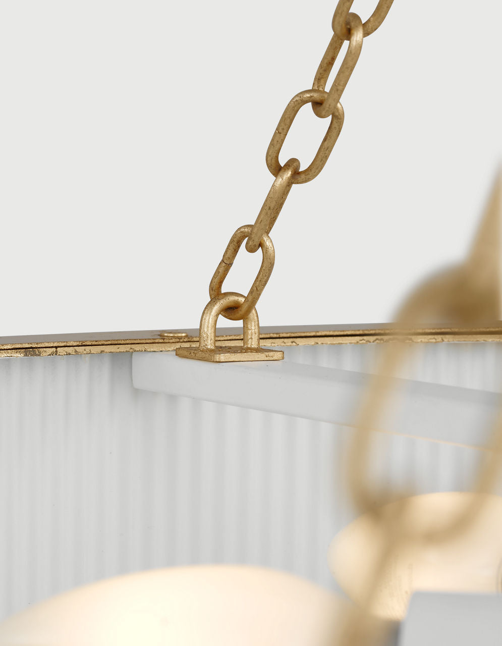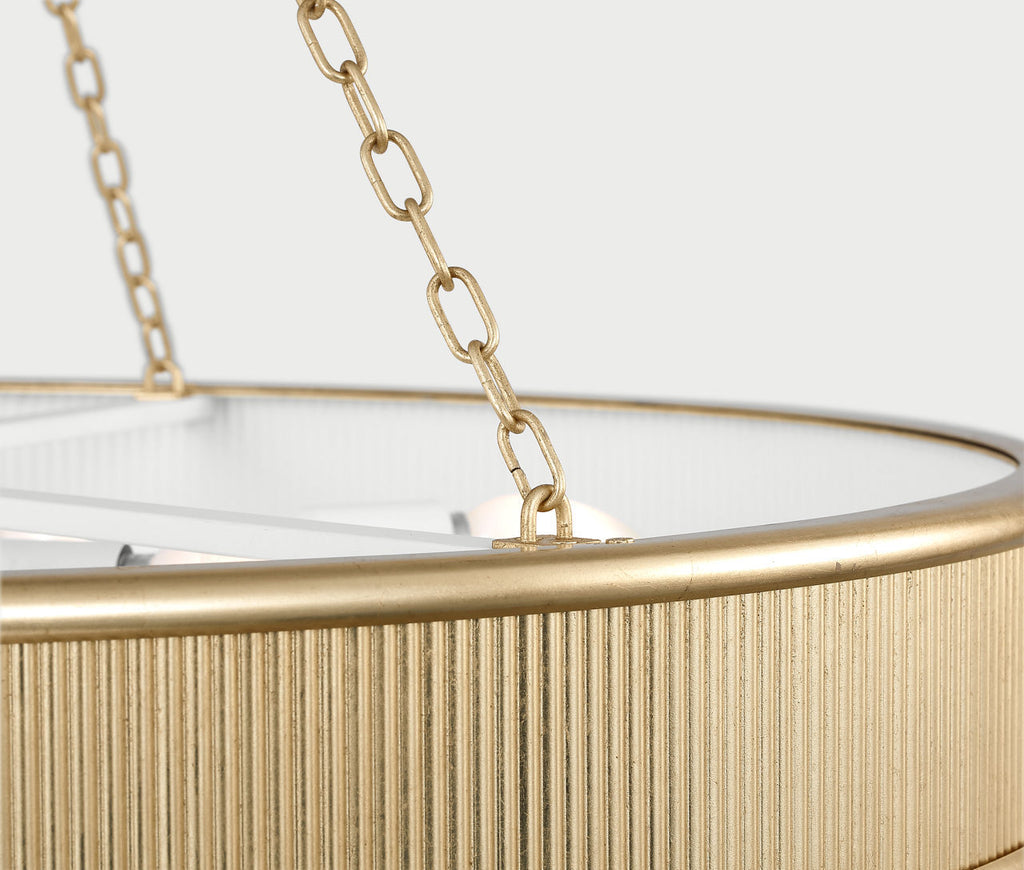 Paloma Contreras' Ritz 36" Chandelier offers a bold interpretation of architectural refinement. Its gracefully scaled silhouette is encircled by a delicately reeded band, inspired by classic millwork. A frosted silk screen glass diffuser lends a soft, luminous quality to the light, enhancing the chandelier's sculptural presence. Balancing tradition with modern restraint, this fixture brings timeless sophistication to dining rooms, living rooms, kitchens, bedrooms, or entry foyers.