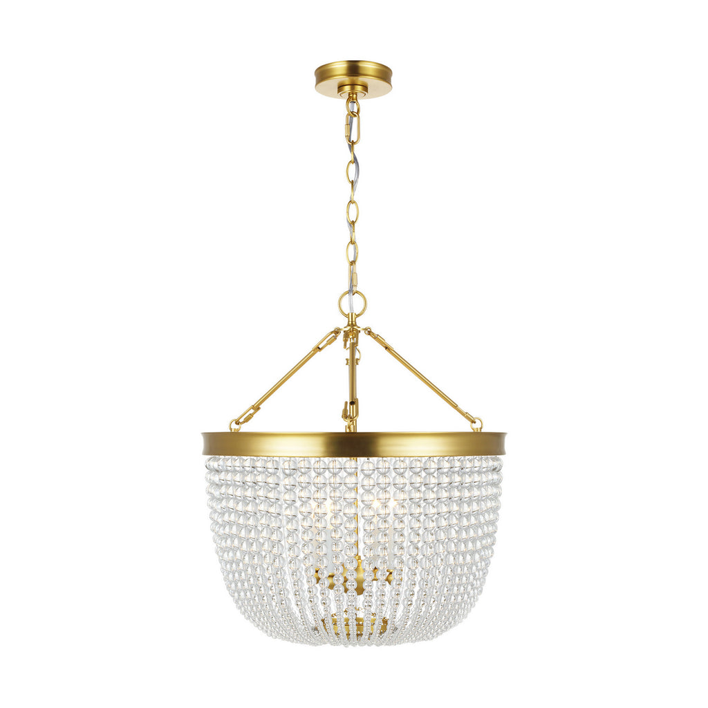 The architectural molding inspired stepped metal frame of the Summerhill collection supports strands of graduated polished clear crystal beads. Designed with two differing profiles - either the full traditional Empire silhouette or in the half basket - both lit from within to cast a shimmering light through the crystal draping. The half basket chandeliers have a traditional candelabra while the full Empire chandeliers have a flat multi-light cluster level with the lower metal band to provide an inconspicuous light source. Each light is capped at the bottom by a unique faceted crystal disc.