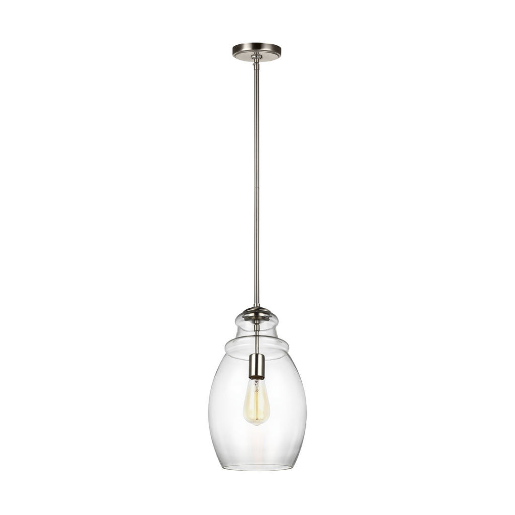 The Marino one light indoor pendant in satin nickel supplies ample lighting for your daily needs, while adding a layer of today's style to your home's décor. Marino features a thick Clear Glass shade with a single lamp suspending downward from the center. The elegant turning detail at the top of the body compliments spaces ranging from traditional to modern. Marino is offered in three distinct finish options: Satin Nickel, Chrome and Oil Rubbed Bronze.