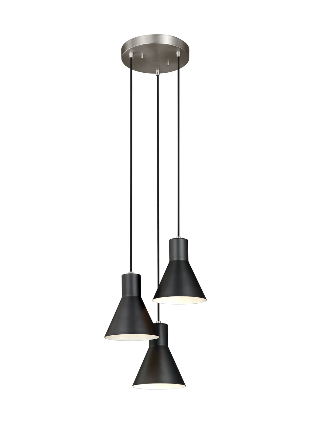 The Towner three light indoor pendant in brushed nickel is an ENERGY STAR qualified lighting fixture that uses LED bulbs to save you both time and money. The Towner lighting collection by brings mid-century, retro style to the traditional circular silhouette, creating a bold statement that would accent any space in your home. The conical light shades deliver a fun design statement along with the textured cloth cords, which are adjustable for leveling. These fixtures are ideal for dining room lighting, living room lighting and kitchen lighting. The assortment includes three-, five- and seven-light chandeliers, three- and five-light cluster pendants, eight-light island pendants, one-light mini pendants, and one-light wall sconces. The Towner Collection is available in two finishes, Satin Bronze and Brushed Nickel to complete the look. All fixtures are available as ENERGY STARÂ-qualified and California Title 24 compliant.