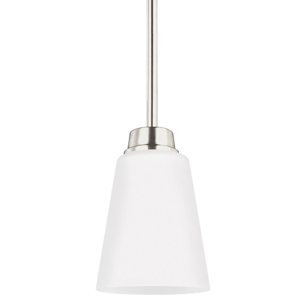 The Kerrville one light mini pendant in brushed nickel is an ENERGY STAR qualified lighting fixture that uses LED bulbs to save you both time and money. With a simple, airy appearance, the Kerrville lighting collection by embraces its modern design roots while enhancing virtually any homes decor. Tubular steel arms extend outward and curve to present beautiful tapered, Satin Etched glass shades. The collection has a Brushed Nickel, Burnt Sienna or Chrome finish and offers three-, five- and nine-light chandeliers, a one-light mini pendant, one- and three-light pendants, a two-light semi-flush mount which can convert to a pendant, and one-, two-, three- and four-light bath fixtures. Incandescent and ENERGY STAR-qualified LED lamping are available, all fixtures are California Title 24 compliant.