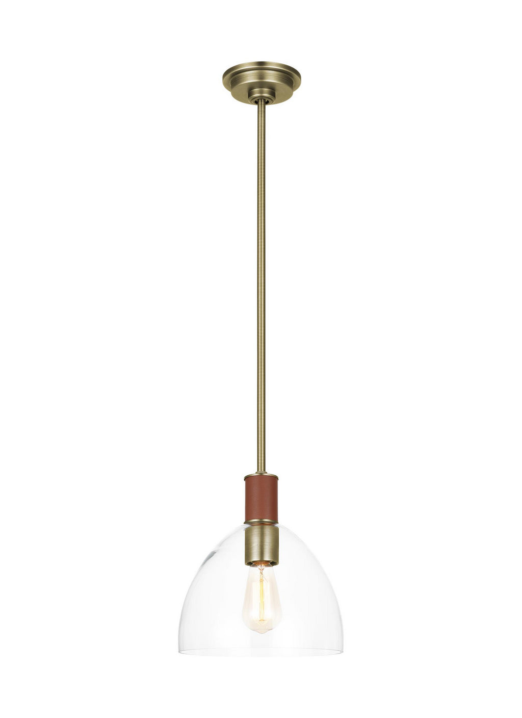 Classic lantern and pendant series with leather details. The combination of leather and steel gives this series equestrian flair. At home in a variety of decors, this small pendant from Lauren Ralph Lauren is simple yet impactful with its leather elements in a Time Worn Brass finish with clear glass shade. With its compact size, we especially love this paired in multiples above a dining room table or kitchen island. A truly transitional series that can be at home in any décor.