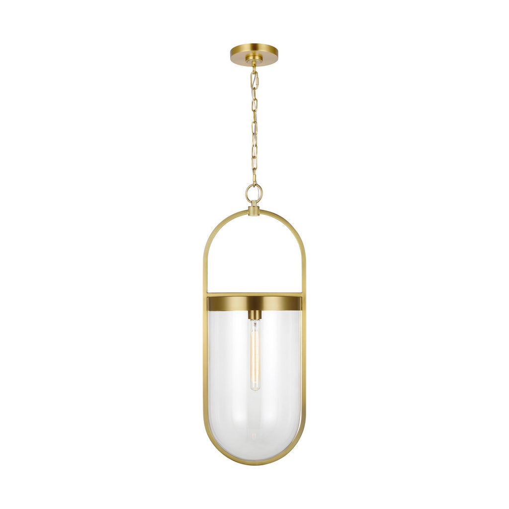 The Blaine one light indoor pendant in burnished brass Chapman & Myers is a simple modern interpretation of a classic glass smoke bell lantern. Each pendant is suspended from a unique oval frame which is circumscribed around an inner glass shade. The glass is held in place by a banded metal collar at the top and lit from within with a single filament bulb.