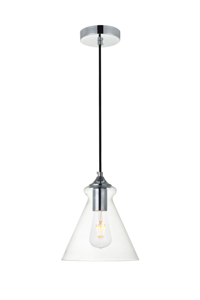 The small, but mighty Destry collection offers sleek pendant lamps that will add a powerful accent to your urban, industrial, or transitional décor. The light's chrome hardware finish adds to the interest of the piece. Chrome 'top hat' design accentuates the clear glass shade. Each chrome and clear conical shade holds one incandescent or LED light bulb (not included). Brighten your kitchen island, bathroom, entryway, or den with this one-light statement fixture. You may adjust the height to your desired length between 15 and 69