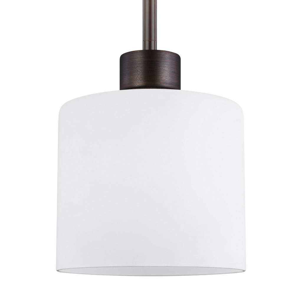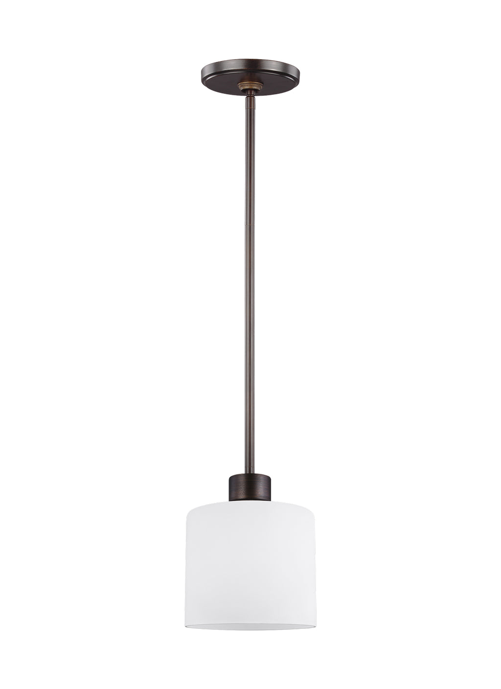 The Canfield one light mini pendant in bronze provides abundant light to your home, while adding style and interest. Behind every seemingly simple design lies unerring attention to restraint and obsessive attention to the tiniest details. The Canfield collection by draws on the modernist traditions of "less is more". Essential functional elements dictate the aesthetics, and clean lines prevail. Layers of intricately finished hand-brushed steel progress vertically to the soft glow of light diffused through finely etched glass diffusors. Canfield offers a "whole home" lighting solution, offering lighting in every imaginable category from the auspicious 15 light 3-tier chandelier, to the concise mini-pendant and one-light sconces. The collection is available in hand brushed Burnt Sienna for a warm, tactile, almost Craftsman design style, or a brushed nickel to emphasize the more architectural elements of your interior.