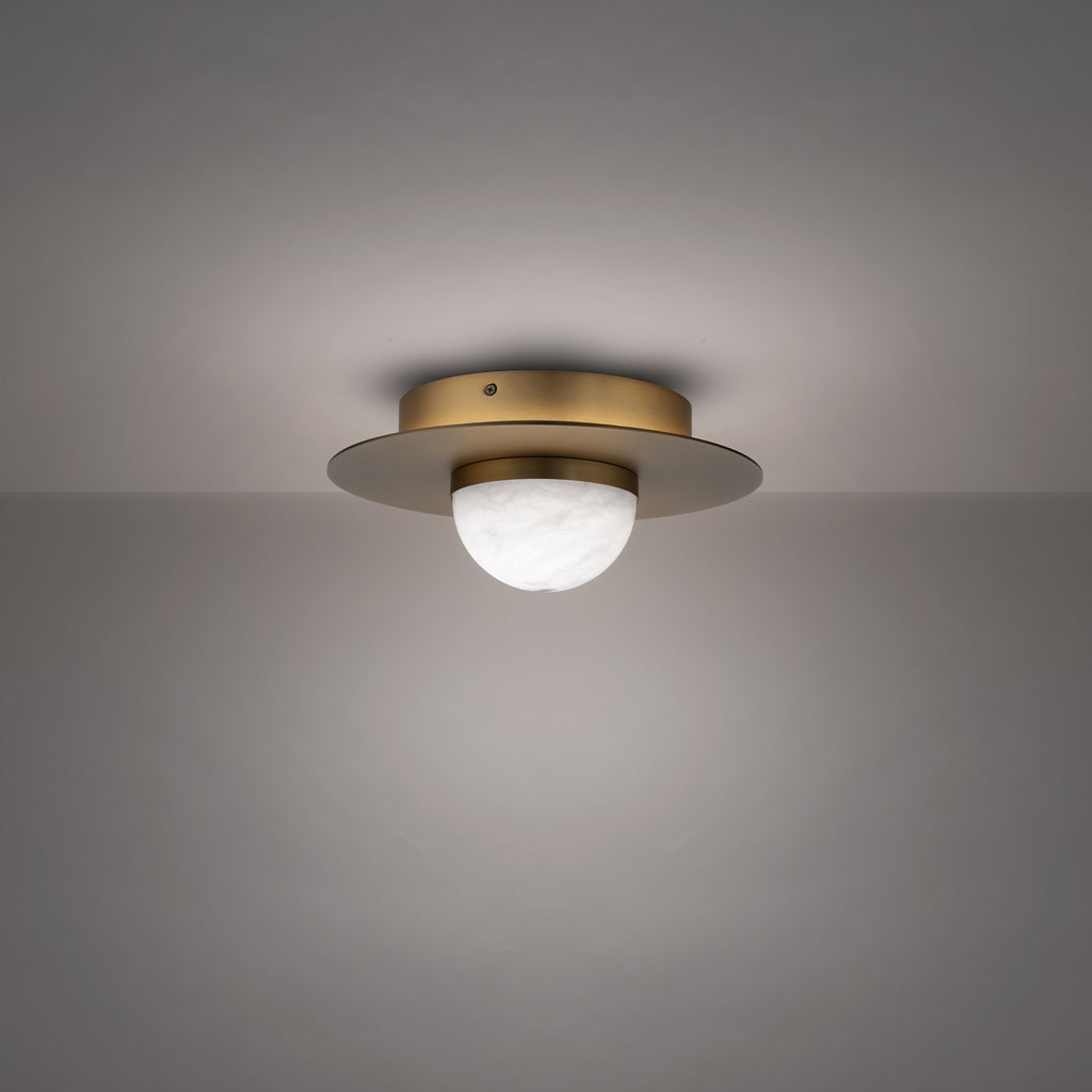 A celestial revelation awaits. The marbled texture and translucent beauty of a natural Spanish Alabaster shade extends from a flat brim, bathing your space with a heavenly glow of illumination.