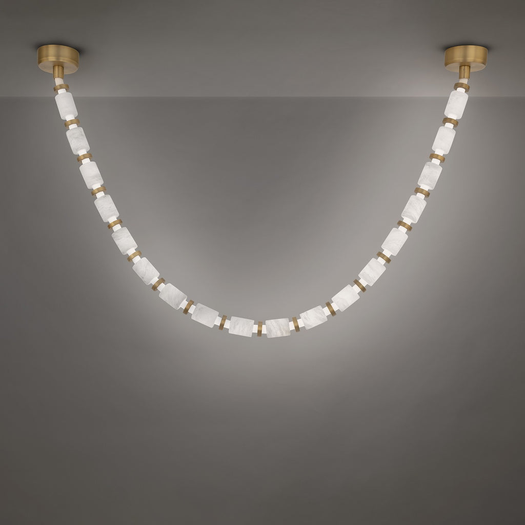 Timelessly tasteful. Cylinders of natural Spanish Alabaster and gleaming metallic collars ornament a silica strand, creating a gemlike presence.