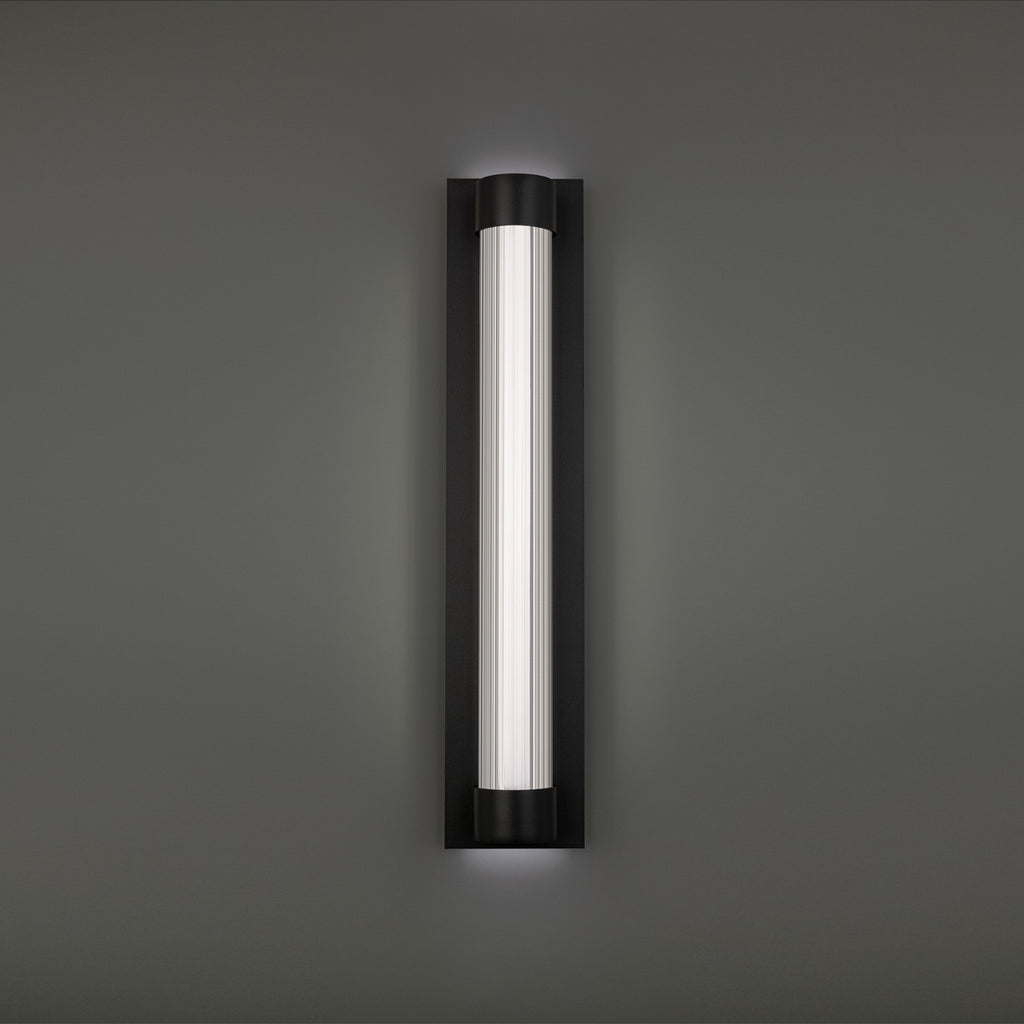 Enhance your façade with the Chyzel outdoor wall light, a polished black rectangle framing a clear column of linear rippled glass. Integrated, color temperature selectable LEDs provide textured illumination that radiates outward, while soft up and down lighting emerges from the top and bottom of the column. Chyzel is offered in 18 and 25-inch sizes and is finished in bold black.