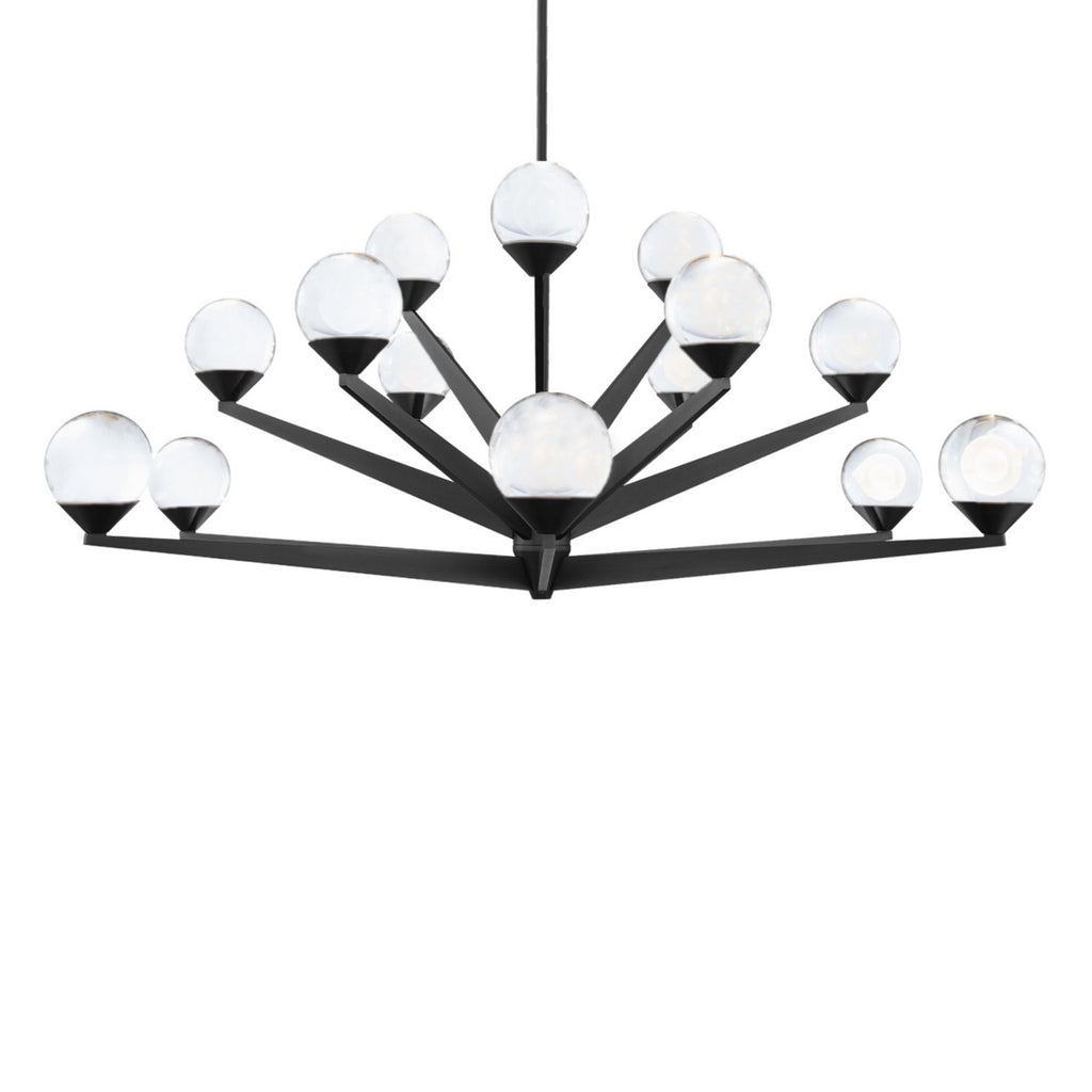 Geometrically concentric spheres round out this chandelier with conversation starting elegance and intrigue. This charming design deploys laser-etched spherical shades embraced by bobeches and arms, providing alluring ambience and aesthetic that delights.