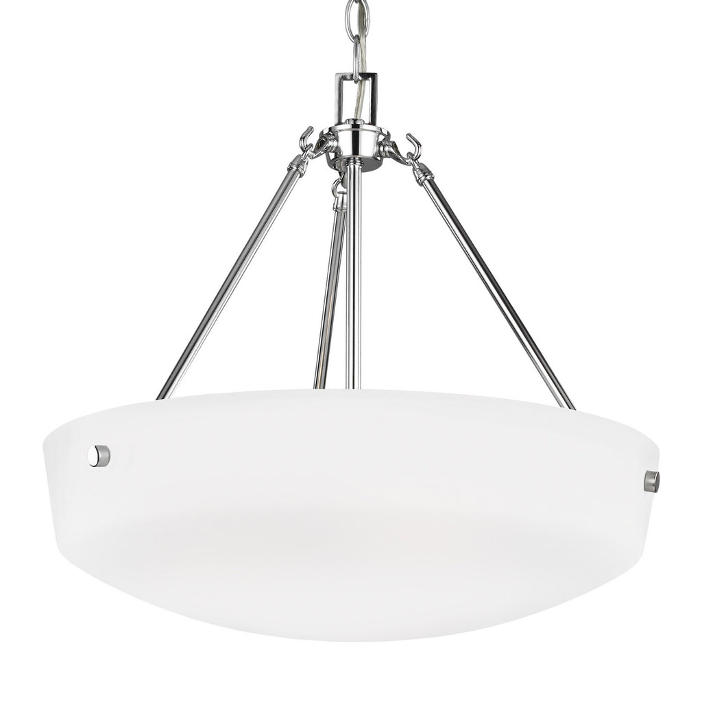 The Kerrville three light indoor pendant in chrome provides abundant light to your home, while adding style and interest. With a simple, airy appearance, the Kerrville lighting collection by embraces its modern design roots while enhancing virtually any homes decor. Tubular steel arms extend outward and curve to present beautiful tapered, Satin Etched glass shades. The collection has a Brushed Nickel, Burnt Sienna or Chrome finish and offers three-, five- and nine-light chandeliers, a one-light mini pendant, one- and three-light pendants, a two-light semi-flush mount which can convert to a pendant, and one-, two-, three- and four-light bath fixtures. Incandescent and ENERGY STAR-qualified LED lamping are available, all fixtures are California Title 24 compliant.