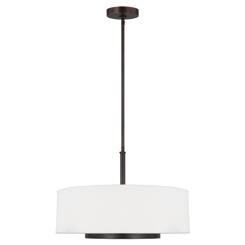 The Nance three light indoor pendant in bronze is the perfect way to achieve your desired fashion or functional needs in your home. The mid-century inspired Nance lighting collection by is a versatile transitional design which fits in a wide array of traditional or contemporary settings. The tapered, off-white, faux silk shades add warmth and sophistication. The large pendant and semi-flush faux silk drum shades are complemented nicely with Satin Etched Opal glass diffusers to soften the downlight. In either of the available Brushed Nickel or Heirloom Bronze finishes, all the Nance fixtures are timeless additions to any foyer, kitchen or dining area. The assortment includes three- five- and nine-light chandeliers, a one-light wall sconce, two- and three-light bath vanities and a two-light semi-flush convertible drum pendant. Incandescent and ENERGY STAR-qualified LED lamping are available, all fixtures are California Title 24 compliant.