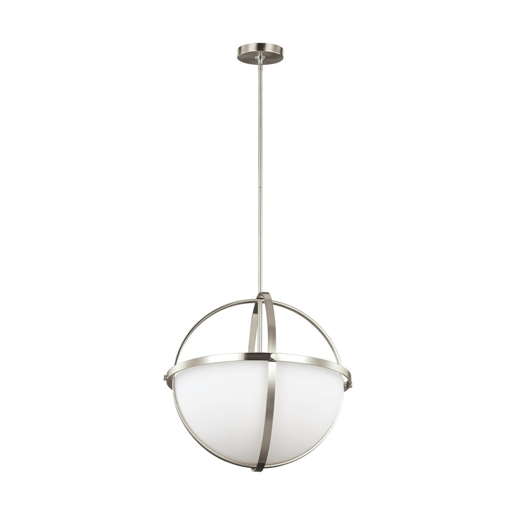 The Alturas three light indoor pendant in brushed nickel provides abundant light to your home, while adding style and interest. The silhouette of the modern Alturas lighting collection by features an interlocking, spherical steel frame, which harkens back to the Unisphere constructed for the 1964 New York World's Fair. The minimalist Alturas Collection draws the eye to the soft, warm glow of the light emitted from the cylindrical Satin Etched glass shades. The full assortment includes three-, five- and nine-light chandeliers, a one-light mini pendant, a three-light pendant, a two-light semi flush which is convertible into a pendant, and one-, two-, three- and four-light bath fixtures. All fixtures are offered in Brushed Oil Rubbed Bronze, Brushed Nickel and Satin Bronze finishes, the bath fixtures are also offered in Chrome finish. Incandescent and ENERGY STAR-qualified LED lamping are available, all fixtures are California Title 24 compliant.
