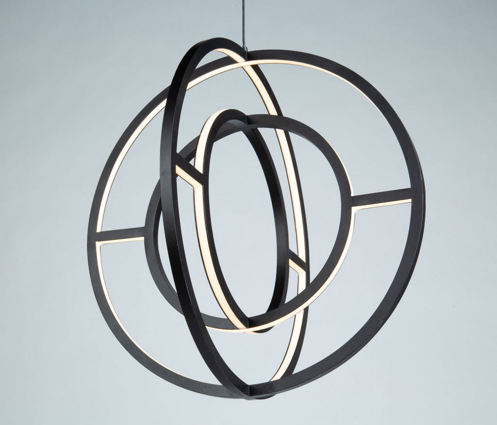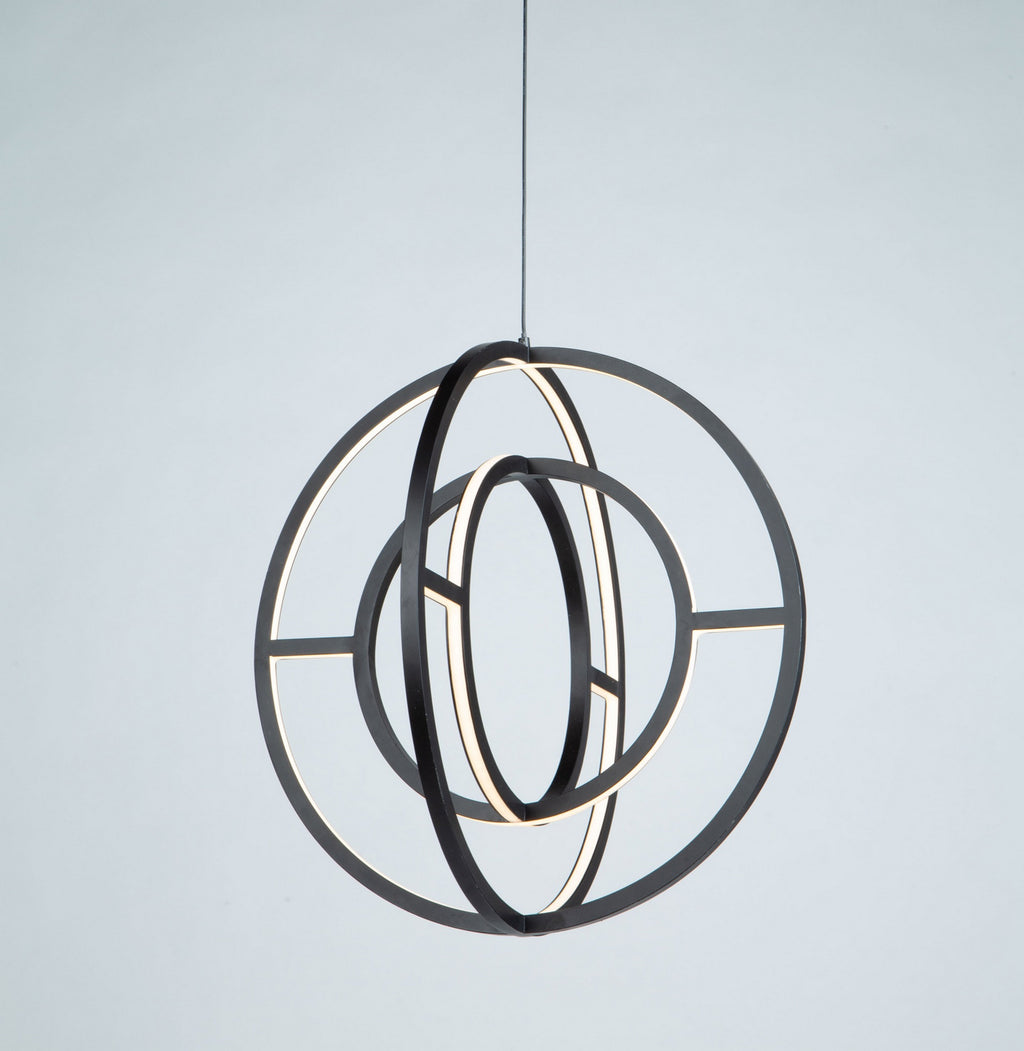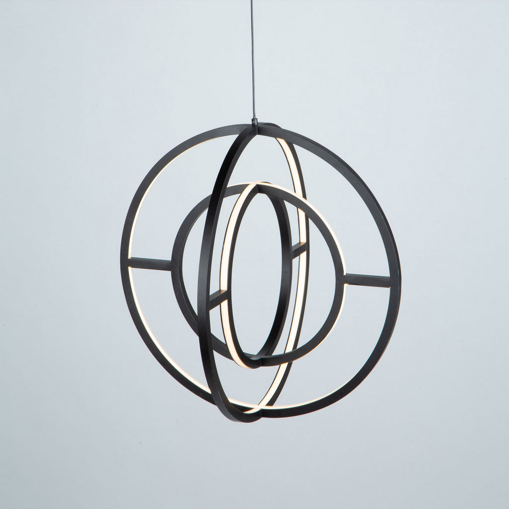 The "Celestial" collection double orb is truly unique and stylish. The matte black finish on this double frame is eye catching. Illuminated by bright energy efficient integrated LED, this chandelier would fit in any surrounding, especially in transitional to contemporary settings. Smaller 16" size also available.