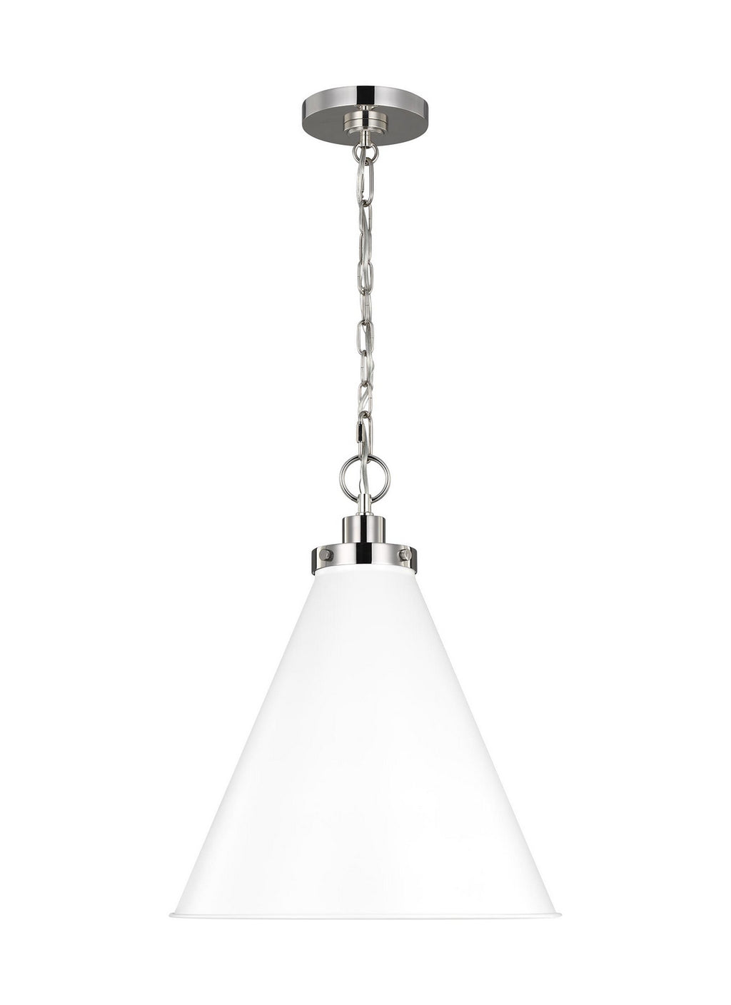 Inspired by various classic utility silhouettes - from factory lighting to barn sconces - capped by contrasting metal hardware. Each shade of the Wellfleet series by Chapman & Myers is available multiple sizes of 3 versatile profiles, either a flat farm dome, a traditional factory dome, or tapered cone. The shades are available with either a black or white finish and are paired with either a burnished brass or polished nickel collar, chain and canopy.