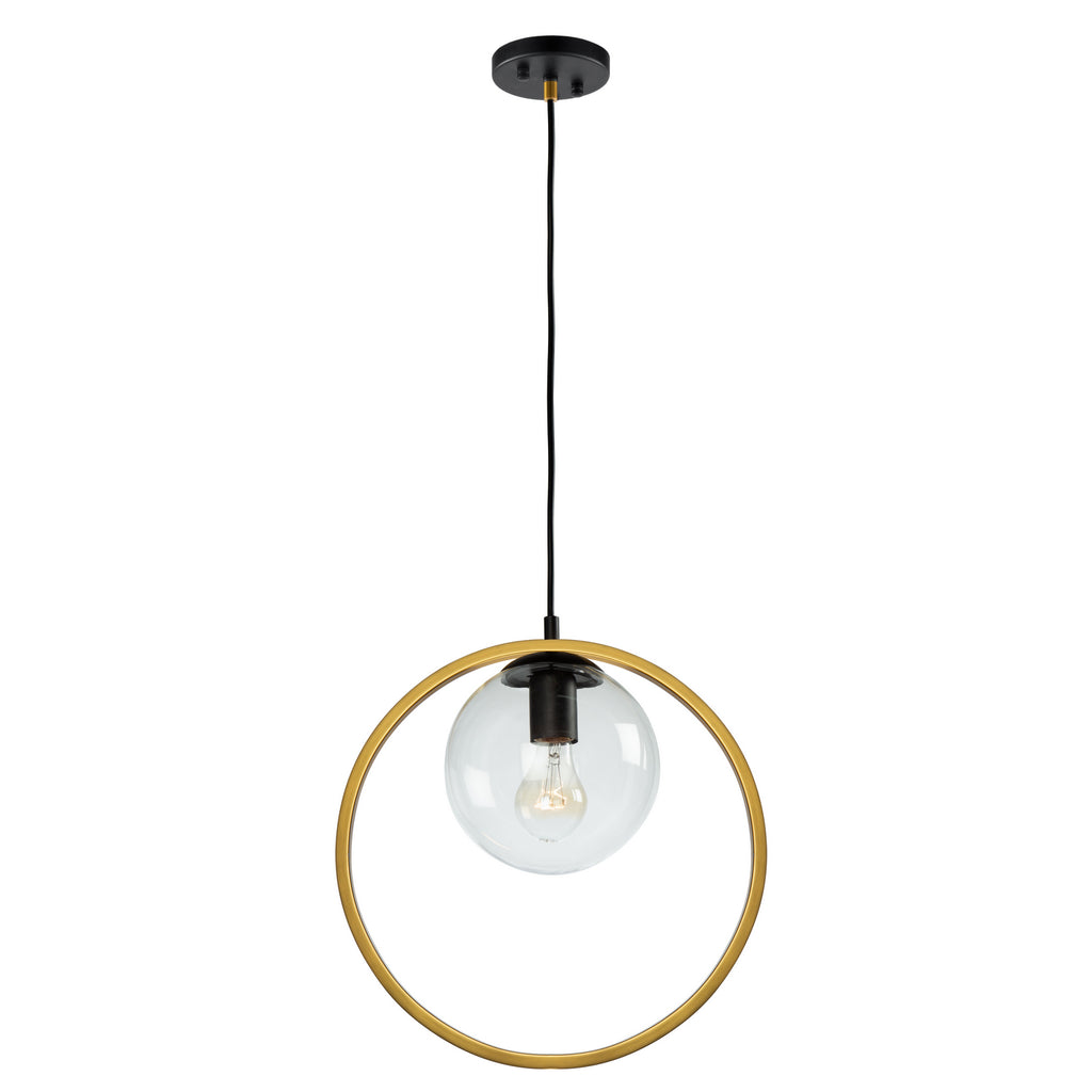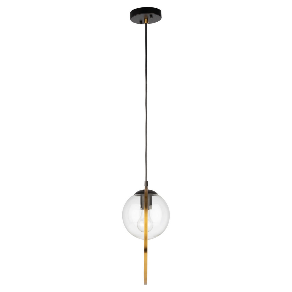 From the Lighting Pulse design firm, this Lugano collection single pendant features clear round glassware which is complimented by a vintage brass encasing on a black frame.