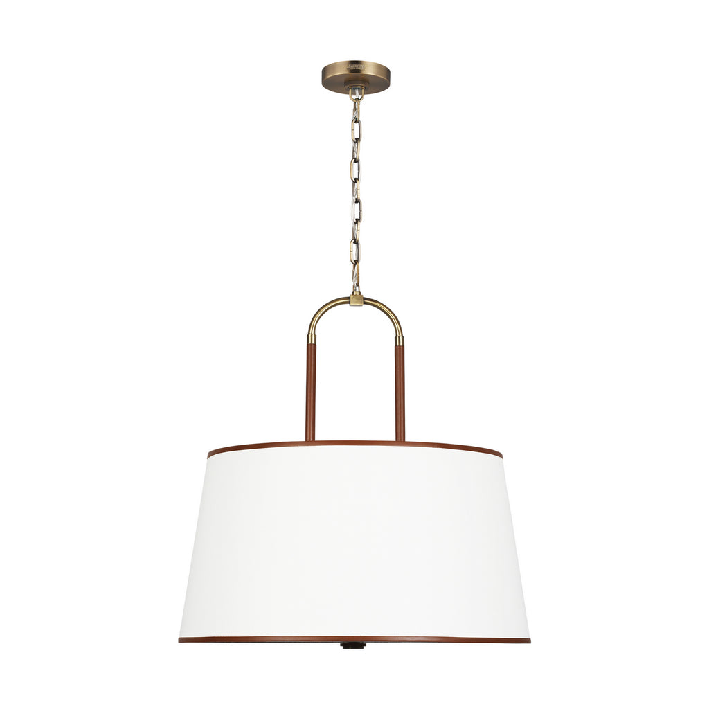 The Katie four-light shade pendant leather straps contrast with metal and white linen fabric shade to round out a timeless design. Available in: Time Worn Brass with Brown Leather or Polished Nickel with Black Leather. The combination of leather and steel gives this round chandelier equestrian flair.