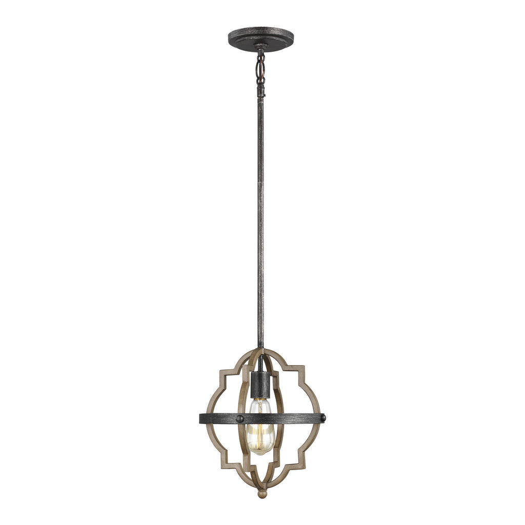 The Socorro one light mini pendant in stardust enhances the beauty of your home with ample light and style to match today's trends. The transitional Socorro lighting series by features a classic, barbed Quatrefoil profile - wholly updated by combining a distressed Cerused Oak finish on the decorative silhouette with the rich Stardust finish on the metal bobeches and decorative strapping to create undeniable rustic charm. While still offered in its original finish Stardust, the Socorro has been beautifully updated with our popular Washed Pine and Chrome finish to offer a modern take on this timeless industrial beauty. The collection includes a four-light mini-chandelier, medium and large six-light chandeliers, and four-light and six-light hall / foyer pendants. Incandescent candelabra base lamping.