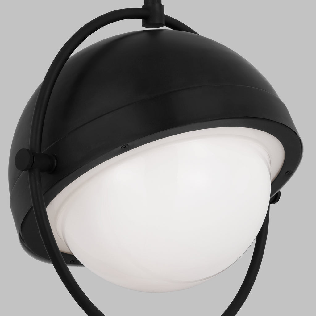 The Bacall one light indoor pendant by Thomas O'Brien is a modern rotating pendant with a deco-era cinematic feel. Glowing beneath the metal shade, the Milk White glass shade softens the light from the bulb inside. Perfect as a direct downlight, it can look unique by positioning it to the right, left, or even rotated entirely upwards.