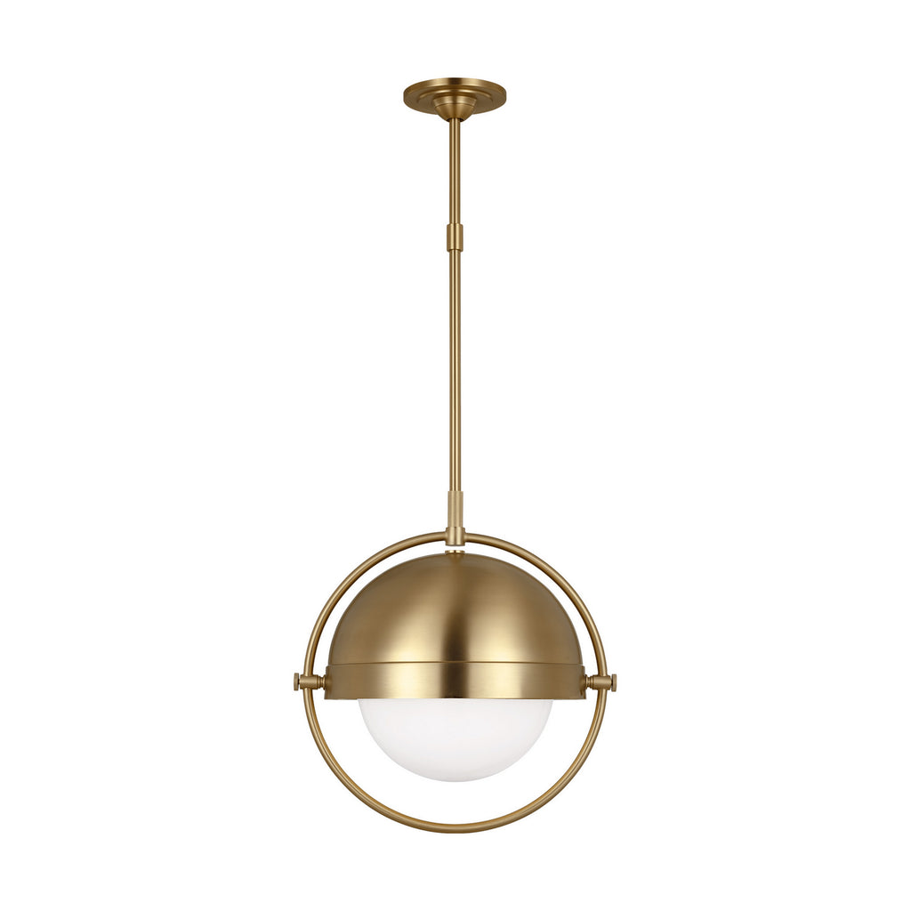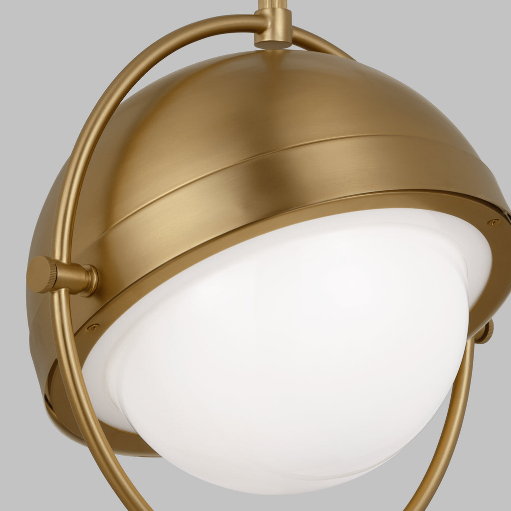 The Bacall one light indoor pendant by Thomas O'Brien is a modern rotating pendant with a deco-era cinematic feel. Glowing beneath the metal shade, the Milk White glass shade softens the light from the bulb inside. Perfect as a direct downlight, it can look unique by positioning it to the right, left, or even rotated entirely upwards.