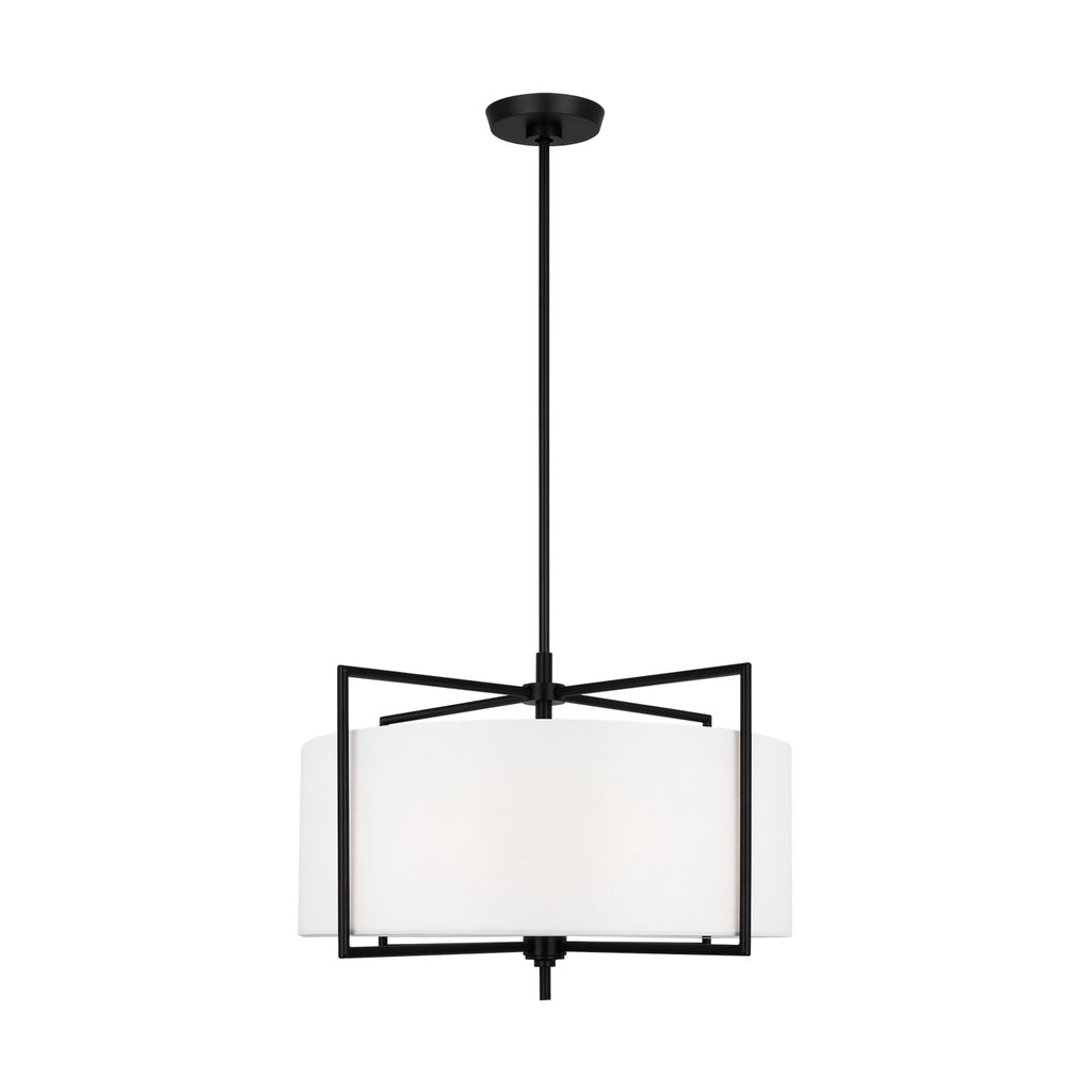 The Perno four-light shade pendant in Aged Iron by Chapman and Myers was inspired by a vintage mid-century French sconce with a simple metal armature. The minimal cruciform structure of the metal frame is the main feature of the design. The frame outlines and supports the inner cylindrical shade. All of the assembly hardware for installing the inner shade was engineered to be hidden in order to maintain the clean and simple aesthetic of the light.
