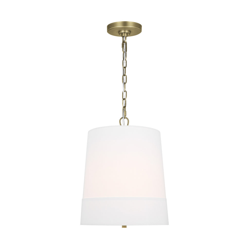 Ivie by Lauren Ralph Lauren is a modern, preppy hanging shade collection that has nautical appeal which gives it a coastal east coast Hamptons vibe. The sleek, fabric shades and etched glass diffusers of the Ivie shade pendant combine to create a warm glow. Finished-off with decorative metal finials to secure the etched glass diffusers in place, these fixtures convey a tailored look while creating both ambient and task lighting. The assortment includes a tall, medium and wide pendant all with classic drum shades, and all are offered in a Time Worn Brass finish. Both incandescent lamping and ENERGY STAR-qualified LED lamping are available, all fixtures are California Title 24 compliant.
