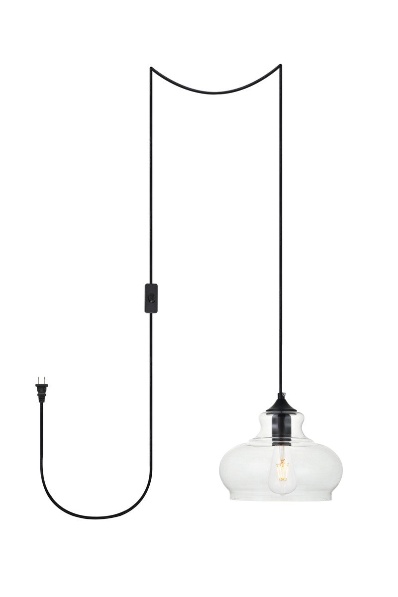 The small, but mighty Destry collection offers sleek pendant lamps that will add a powerful accent to your urban, industrial, or transitional décor. The light's black hardware finish adds to the interest of the piece. Black 'top hat' design accentuates the clear glass shade. Each black and clear sugar pot shade holds one incandescent or LED light bulb (not included). Brighten your kitchen island, bathroom, entryway, or den with this one-light statement fixture. Plug-in design for easy access lighting with built-in on/off switch. Simply hang this piece on the provided swag hooks and plug it in for an effortlessly easy installation - can be hung from a sloped or vaulted ceiling.