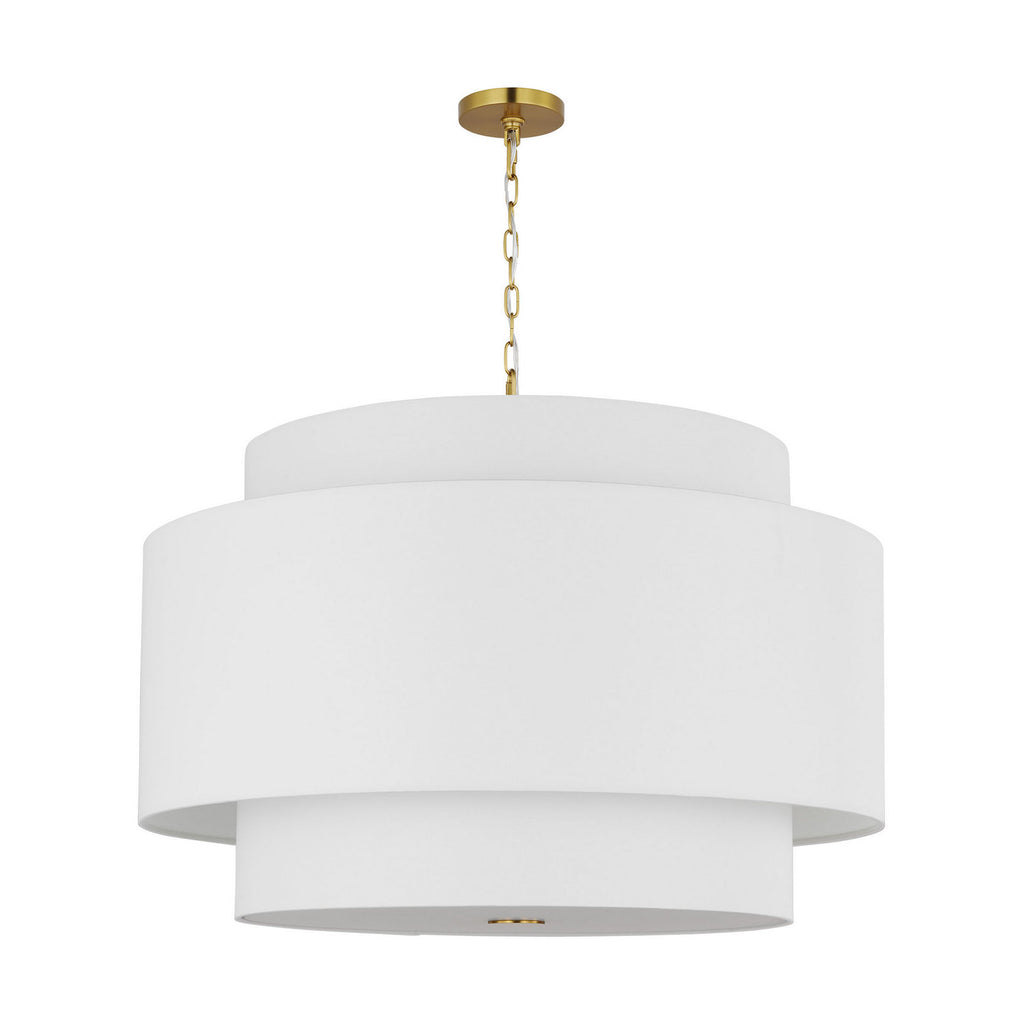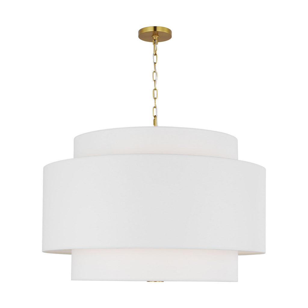 Inspired by kate spade new york whimsical geometry and playful lines, Sawyer has a striking silhouette with graphically taped shades. The Sawyer is a wide playful hanging shade with arched lines and wide, graphically taped shades. This simple and graphic chandelier would be great over a dining table or nook, as well as in a living room scenario.