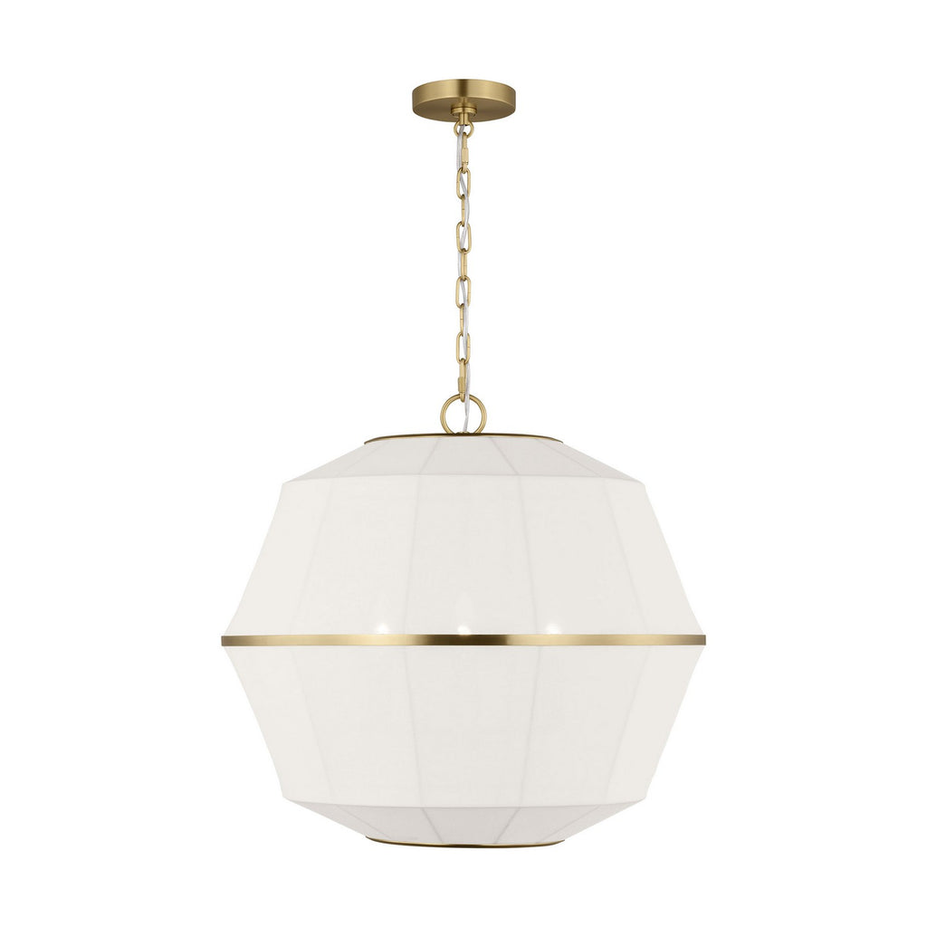 Showcasing multifaceted geometry, the Hikari series by Ellen DeGeneres is inspired by her personal collection of sculptural lighting. Grounded by the contrast of hard and soft materials, the aged iron and white linen fixture radiates soft, diffused light. The Hikari pendant can be used in a dining room, living room, bedroom or entryway.