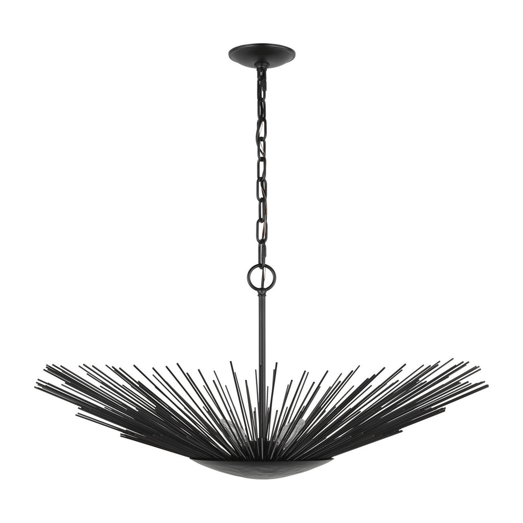 Named after the Greek God of the Sun, the Alexa Hampton Helios series is made with hand-applied gold leaf and then hand-distressed. This Mid-Century Modern fixture takes the shape of its name, with up-flowing stems resting elegantly on a round metal canopy. Straw-like brass layers of hand-cut, hand-welded metal rods form the shade of this textural fixture. The Helios series features a dynamically cut, sun-like form and gilded iron finish. This stunning piece is an eruption of light and brings a stylish presence to any aspect of your space. The assortment included fresh takes on traditional looks, beautiful and unique hand-applied finishes, and stunning, thoughtful-inspired sculptures.