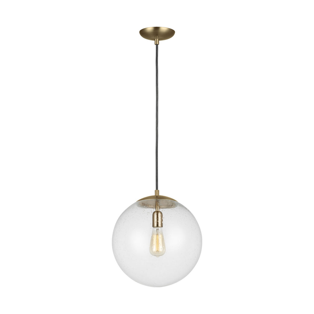 The Leo - Hanging Globe one light indoor pendant in satin brass is an ENERGY STAR qualified lighting fixture that uses LED bulbs to save you both time and money. While hanging globes are one of lighting's hottest trends, Sea Gull's timeless Leo Collection has been around for 50 years! Constantly evolving with the times, these classic pendants are now offered with NEW Clear Seeded glass and in Satin Aluminum finish. Adjustable cloth cords allow for unlimited variations of hanging heights. All glass softly diffuse the light, each fixture comes with 54†of cuttable cord to customize the installation exactly to your needs. Easily convert every piece in the collection to LED by purchasing LED replacement lamps sold separately. All fixtures are qualified and California Title 24 compliant and damp rated for use in sheltered, damp environments like bathrooms, covered patios or porches.