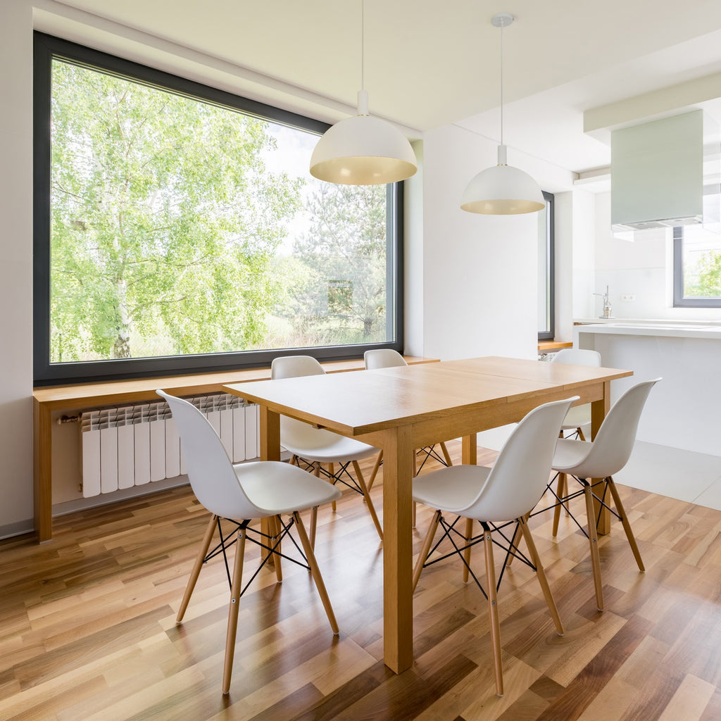 Single-lamp pendant with aluminum dome shade showcasing powder-coated or plated finishes with metal details and a matte white interior. Exterior shade colors are black, brushed nickel, or white. Suspended by cloth cable. Available in three sizes.