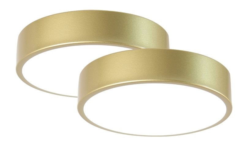 LÁMPARA DE TECHO TIPO PLAFON EMPAQUE DUO, LED 12W, INTERRUPTOR PARA ELEGIR TONALIDAD DE LUZ CCT: 30K,40K,60K, 110-240V, ACABADO DORADO, DIMENSIONES: D-23CM H-5CM, GRADO DE PROETCCION IP20, MATERIAL METAL + ACRILICO, MARCA HOME DELIGHT.