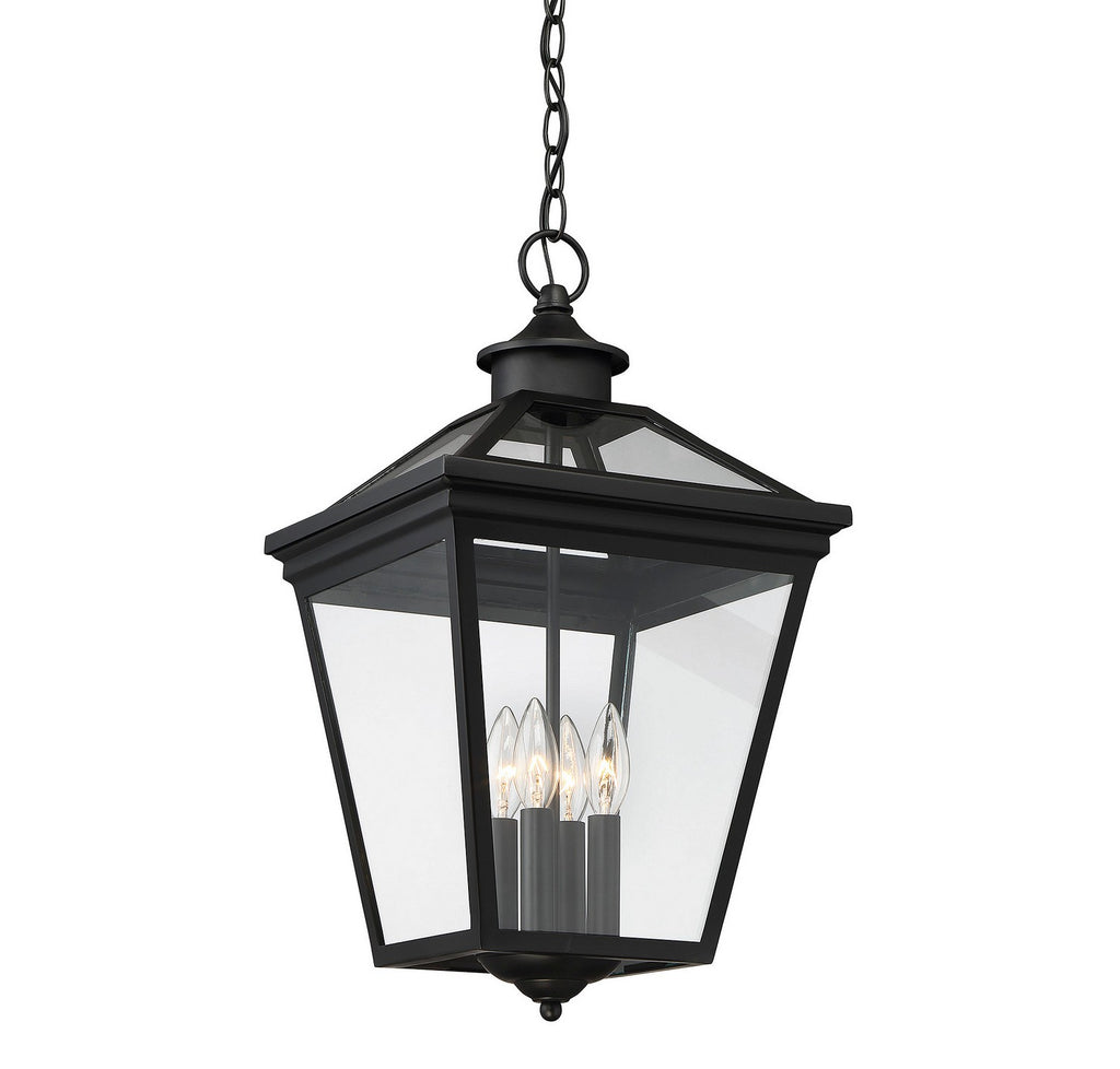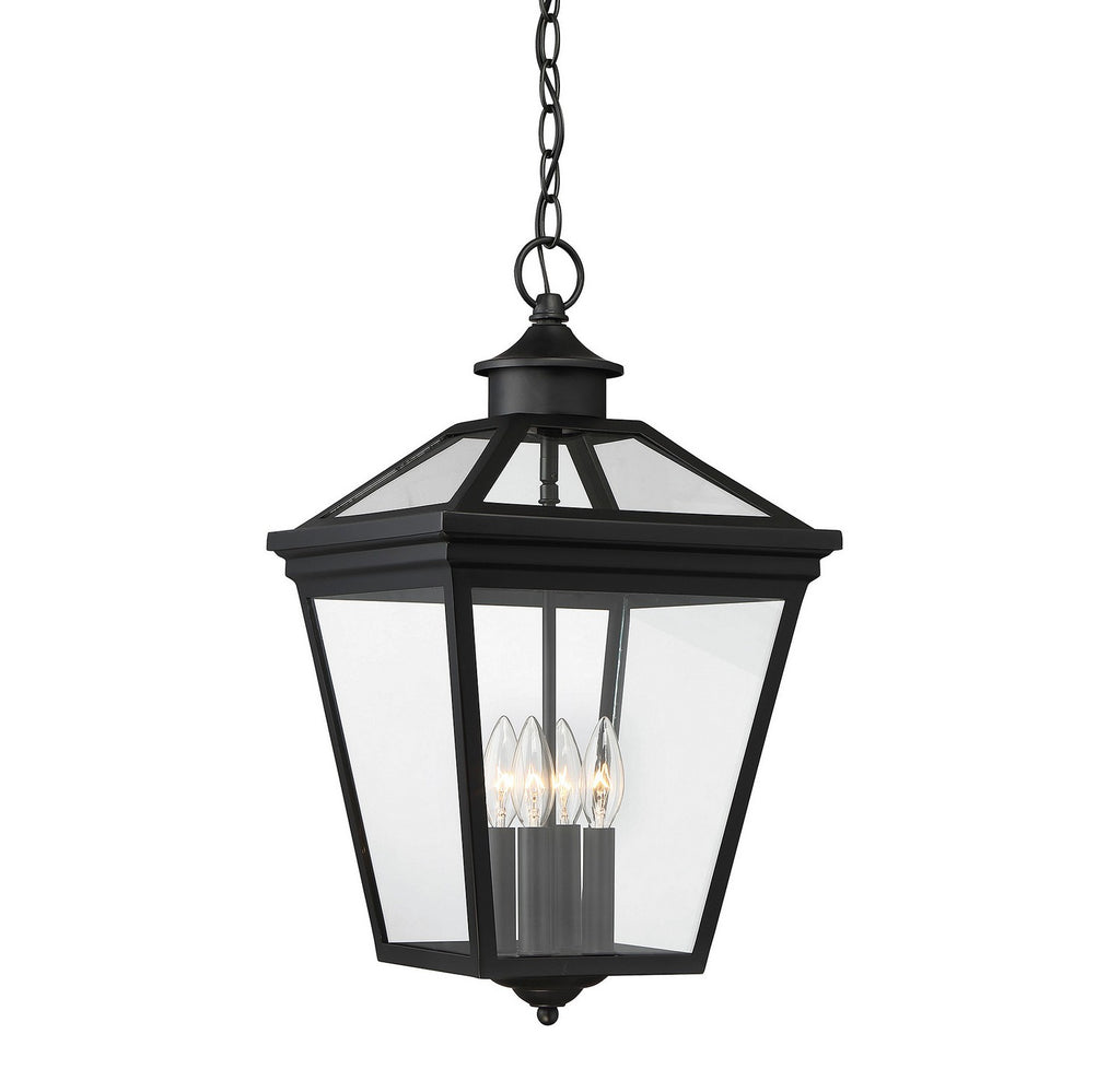 Brighten the exterior of your home and welcome your guests in style with the Savoy House Ellijay 4-light outdoor hanging lantern. The design mimics a vintage gas lantern with a classic tapered box shape and decorative top finial. The black finish looks terrific and blends well with other hardware and architectural materials. Panes of clear glass fill all four side panels and the roof panels, too. Four 40W candelabra size bulbs provide inviting and secure illumination. This lantern measures 12" wide and 20.75" high. You'll enjoy its timeless style and enhance the beauty of your property, whether on your porch, patio, sunroom, pergola or hung from other outdoor ceilings in your garden and yard.
