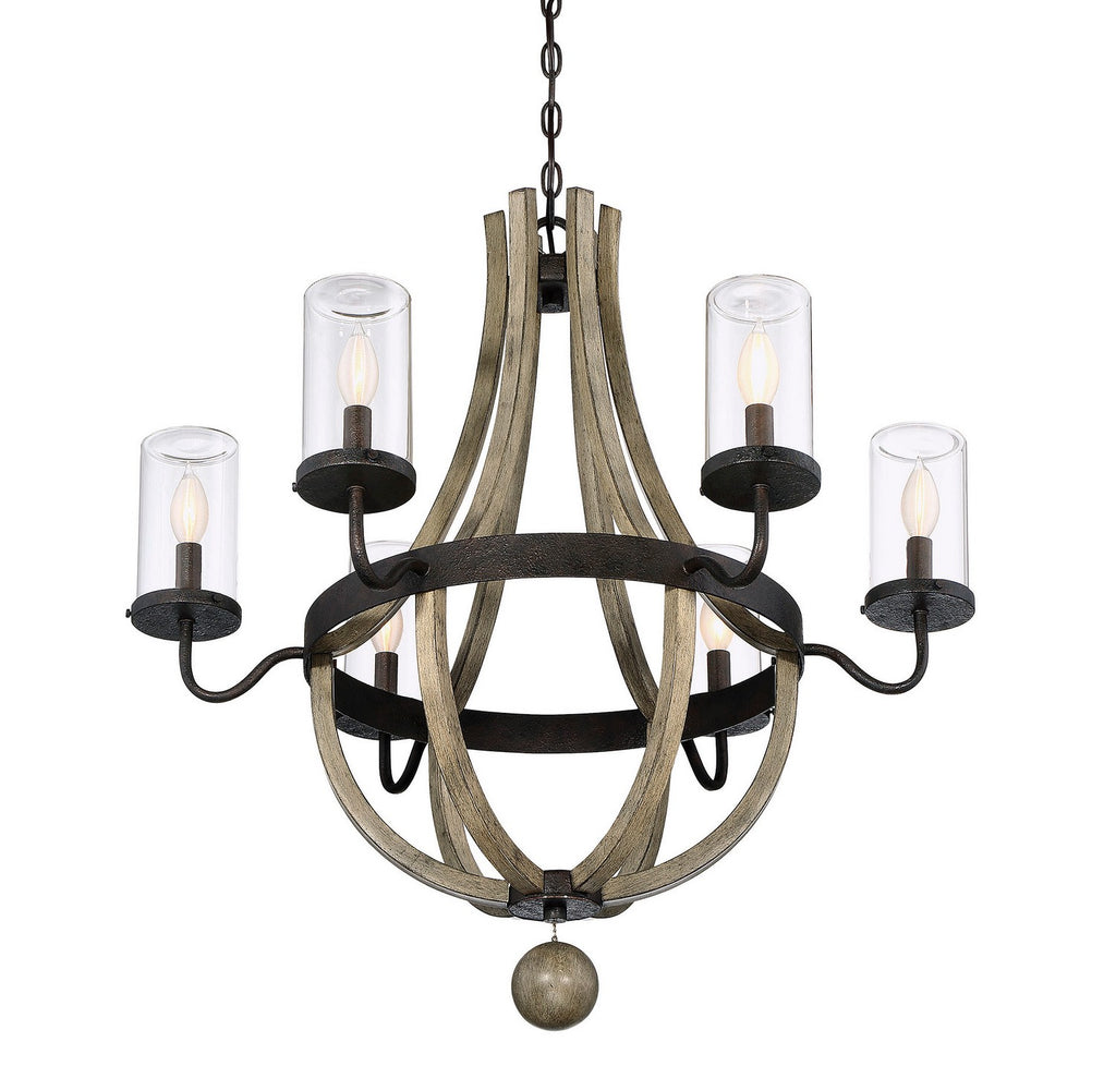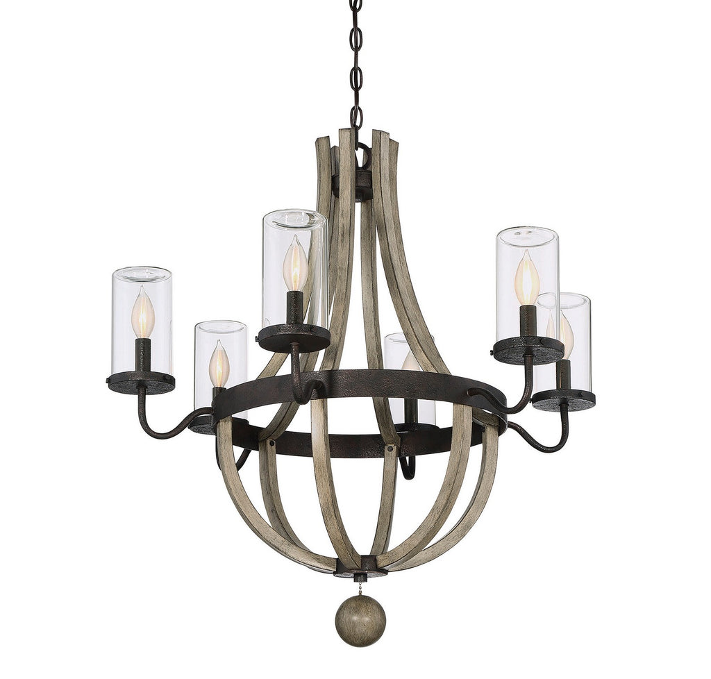 Looking for high end outdoor lighting to help turn a porch or patio into a beautiful exterior living space? The Eden 6-light outdoor chandelier from Savoy House is a great choice. This gorgeous exterior light fixture features a gently curving metal frame coated with a Weathervane finish to give it a wonderfully rustic wood look. A band of dark metal encircles the frame, and six metal candleholders hold candelabra bulbs that shine within clear glass cylinders. A single finial, also finished in Weathervane, completes the simple yet striking design. This damp area rated garden chandelier is built to withstand the elements when enjoyed in a covered area. It's the ideal outdoor porch lighting for spaces featuring rustic and transitional décors.