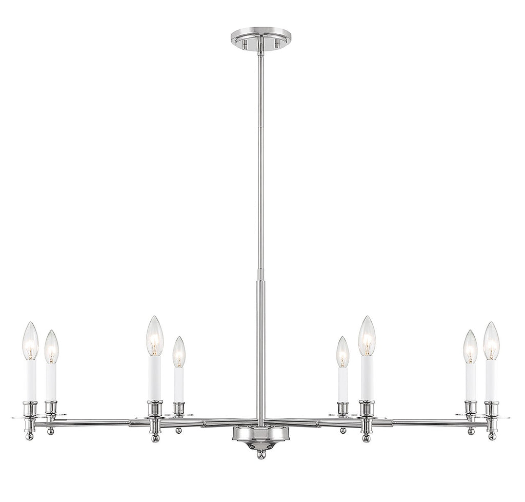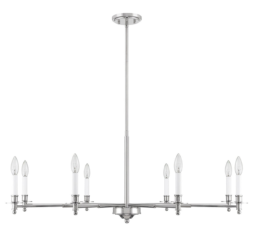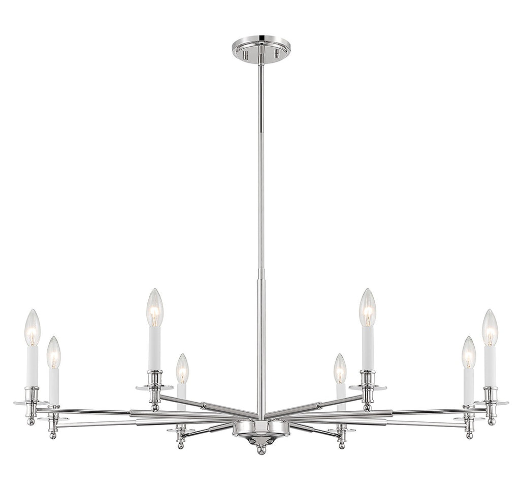 The Savoy House Jasmine 8-light chandelier has a traditional-inspired look that is perfectly versatile for a wide range of spaces and styles. Polished nickel finish with white candle covers. Jasmine is 42" in width and has an adjustable height ranging from 16" to 69.5". Comes with four 12" downrods and one 6" downrod. It uses 8 candelabra size bulbs of up to 60 watts per bulb (bulbs not included).